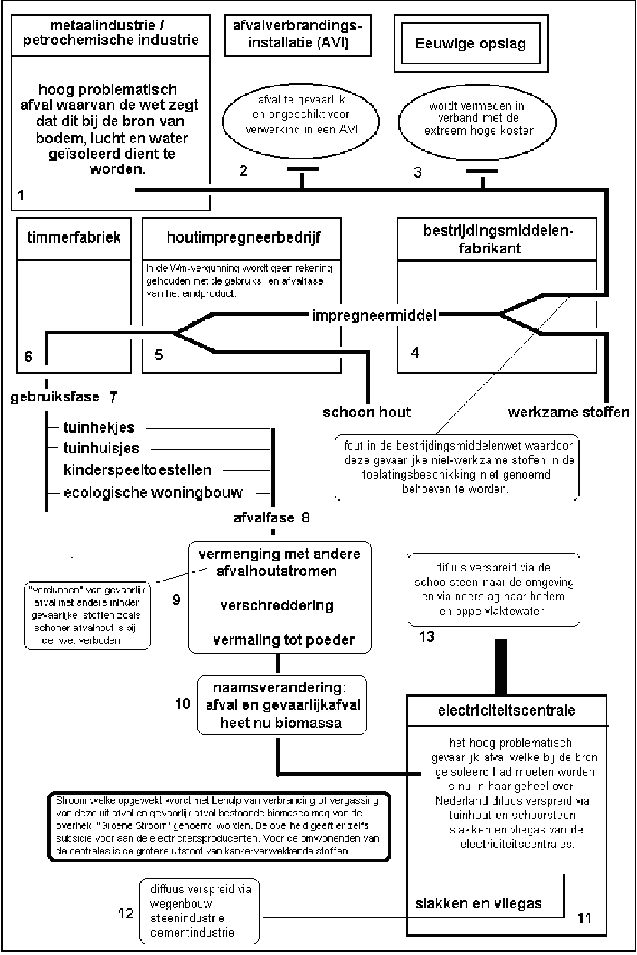 - Op grond van deze wet behoeven de niet-werkzame chemische stoffen niet te worden genoemd. Met deze ingebrachte tekortkomingen in de Bestrijdingsmiddelenwet wordt het hoogproblematisch gevaarlijk afval van de metaal- en petrochemische industrie, aangevuld met een bepaalde hoeveelheid werkzame stoffen om aan het toegelaten percentage te komen, omgezet tot een bestrijdingsmiddel voor het impregneren van hout.
