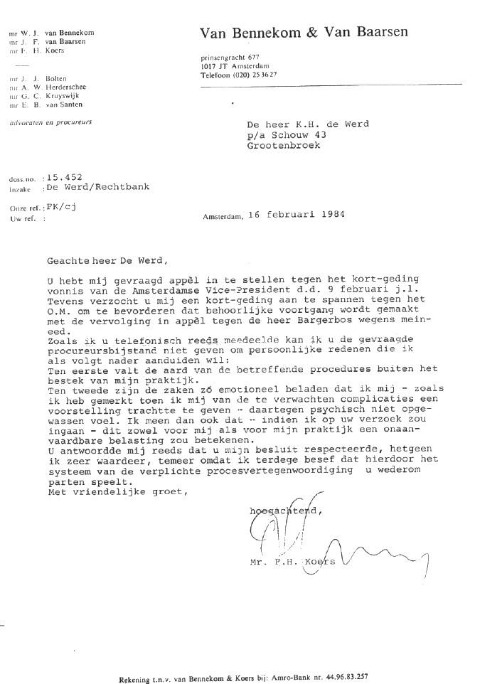 Mr. Koers Advocaat: "De zaken zijn zo emotioneel beladen, dat ik mij zoals ik heb bemerkt, toen ik mij van de te verwachten complicaties een voorstelling trachtte te geven, mij daartegen psychisch niet opgewassen voel, evident waaraan ik uw juridische belangen niet kan behartigen. Ik besef terdege dat hierdoor het systeem van de verplichte procesvertegenwoordiging u wederom parten speelt.