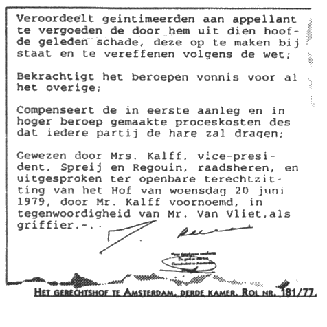 K.H. de Werd: "De betrokken rechters ter zake functioneerden op en niveau, zoals men dat in een beschaafde samenleving ter goeder trouw van rechters niet zou mogen verwachten, het algemeen belang vereist, dat hun namen worden genoemd, zodat zij worden genoodzaakt hun toga's definitief aan de kapstok te hangen voor zover zij dat tot op heden nog niet hebben gedaan. Zij allen hebben het over de grootste juridische zwendel affaire uit de Nederlandse rechtsgeschiedenis".