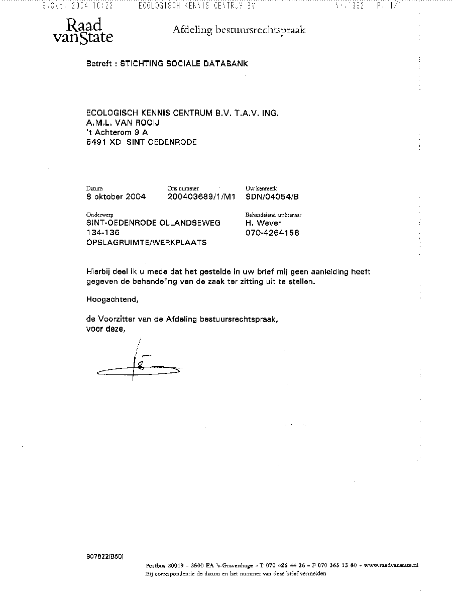 Per fax 070 - 3651380 Aan: Mr. F.B. van der Maesen de Sombreff (persoonlijk). Ambtenaar van Staat van de Raad van State Postbus 20019, 2500 EA 's-Gravenhage. Sint Oedenrode, 7 oktober 2004. Ons kenmerk: SDN/04054/B Uw nummer: 200403689/1/M1. Betreft: Stichting Sociale Databank Nederland (appellant)/ Eis tot het nemen van een besluit waarbij de behandeling van opgemelde zaak, ter zitting gepland op 14 oktober 2004 tot een nader te bepalen tijdstip wordt uitgesteld. Geachte heer van der Maesen de Sombreff, Namens de Stichting Sociale Databank Nederland, Gasthuislaan 22, 6883 JK te Arnhem, hierna te noemen: appellant, bericht ik u als volgt: Bij brieven van 30 september 2004 en 3 oktober 2004 heb ik u in opgemelde zaak nummer 200403689/1/M1 op de 13e en 11e dag vóór de zitting nadere stukken laten toekomen. Bij brief van 5 oktober 2004 stuurt u die stukken aan mij terug met de mededeling dat die niet toegespitst zijn op het onderhavige geschil en derhalve niet aan het dossier worden toegevoegd. Naar mijn mening betreft het hier wel degelijk voor dit geschil zeer essentiële informatie. Men kan hierover van mening verschillen, echter ik wijs u er op dat in de Algemene wet bestuursrecht nergens voorschriften opgenomen zijn ten aanzien van het op het geschil toegespitst dienen te zijn van nadere stukken, laat staan enige criteria waarmee dit toegespitst zijn door een behandelend ambtenaar, op voorhand in de plaats tredend van de bevoegde rechter, naar eigen inzicht nadere stukken uit een dossier kan verwijderen. Daarmee hebt u gehandeld in strijd met artikel 7:18, eerste lid, van de Algemene wet bestuursrecht. Ingevolge artikel 7:18, tweede lid, van de Algemene wet bestuursrecht is het beroepsorgaan wettelijk verplicht om het 'complete' dossier voorafgaand aan het horen gedurende tenminste een week voor belanghebbenden ter inzage te leggen. Met het terugsturen van de door mij bij brieven van 30 september 2004 en 3 oktober 2004 tijdig ingediende nadere stukken heeft u in strijd met artikel 7:18, tweede lid, van de Algemene wet bestuursrecht op onwettige wijze voor belanghebbenden een niet compleet dossier ter inzage gelegd en daarmee voor hen zeer essentiële informatie achtergehouden. Met klem verzoek ik u dit alles te corrigeren binnen 24 uur na heden en ondergetekende dat schriftelijk te bevestigen. Deze correctie zal moeten inhouden: