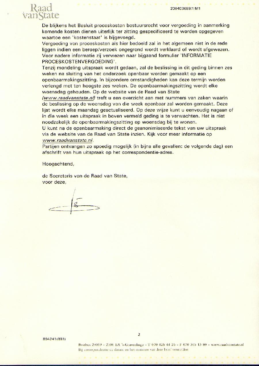 Namens de Stichting Sociale Databank Nederland, Gasthuislaan 22, 6883 JK te Arnhem, hierna te noemen: appellant, bericht ik u als volgt: Opgemelde zaak 200403689/1/M1 wordt door u als lid van de enkelvoudige kamer van de Afdeling bestuursrechtspraak van de Raad van State op 14 oktober 2004 om 10.45 uur ter zitting behandeld. Bij brieven van 30 september 2004 en 3 oktober 2004 heb ik u in deze zaak op de 13e en 11e dag voor de zitting nadere stukken laten toekomen. In uw uitnodigingsbrief d.d. 6 september 2004 nummer 200403689/1/M1 schrijft u ons daarover letterlijk het volgende: "In dit geding kunt u nadere stukken indienen, mits deze uiterlijk op dezelfde dag van de zitting in het bezit zijn van de afdeling." Uw Afdeling heeft de door mij bij brieven van 30 september 2004 en 3 oktober 2004 verzonden stukken op 1 en 3 oktober ontvangen en derhalve tijdig. Als feitelijk bewijs daarvoor vindt u betreffende brieven, voorzien van een Raad van State stempel (zie bijlage 1 en 2) bijgesloten. Ik verzoek u kennis te nemen van de inhoud en die inhoud hier als herhaald en ingelast te beschouwen. Ondanks het feit dat u wettelijk verplicht bent om deze bij brieven van 30 september 2004 en 3 oktober 2004 toegezonden nadere stukken aan het procesdossier toe te voegen, krijg ik die bij brief van 5 oktober 2004 teruggestuurd van de voorzitter van de Afdeling bestuursrechtspraak, voor deze ondertekend, door ambtenaar van staat mr. F.B. van der Maesen de Sombreff, met de mededeling dat deze stukken niet aan het dossier zullen worden toegevoegd (zie bijlage 3). De voorzitter van de Afdeling bestuursrechtspraak van de Raad van State is dr. E.M.H. Hirsch Ballin. Deze hoofdzaak wordt door u op 14 oktober 2004, als lid van de enkelvoudige kamer, behandeld. Om die reden werpen zich hier dan ook de volgende vragen op: Vraag 1. Hoewel niet aannemelijk: Heeft mr. F.B. van der Maesen de Sombreff mijn tijdig ingezonden nadere stukken inderdaad in opdracht van dr. E.M.H. Hirsch Ballin aan mij teruggezonden met de opzet deze uit het procesdossier te weren en de daarin vermelde feitelijke informatie buiten uw kennisname te houden? Vraag 2. Hoewel niet aannemelijk: Heeft mr. F.B. van der Maesen de Sombreff mijn tijdig ingezonden nadere stukken misschien in opdracht van u, zijnde mr Drupsteen, als lid van de enkelvoudige kamer die deze hoofdzaak behandeld, teruggestuurd met de opzet deze uit het procesdossier te weren zodat de daarin vermelde feitelijke informatie niet in uw oordeel behoeft te worden meegewogen? Vraag 3. Heeft mr. F.B. van der Maesen de Sombreff mijn tijdig ingezonden nadere stukken, zonder daarin mr. E.M.H. Hirsch Ballin, als voorzitter van de Afdeling en zonder mr. Th.G. Drupsteen, als lid van de enkelvoudige kamer, daarin te hebben gekend, misschien met opzet en uit eigen beweging genoemde tijdig ontvangen nadere stukken uit het procesdossier doen verwijderen ? Ingeval mr. F.B. van der Maesen mijn tijdig ingezonden nadere stukken, vergezeld van een door hem ondertekende brief van 5 oktober 2004 zelfstandig heeft teruggestuurd, betekent dit dat hij daarmee een strafbaar feit heeft gepleegd. Omdat er dan sprake is van opzet betekent dat hij daarmee ook een misdrijf heeft gepleegd. Gezien de ernst van dergelijk misdrijf heb ik mr. F.B. Maesen de Sombreff bij brief van 7 oktober 2004 verzocht om dit alles te corrigeren en deze wetsovertredingen ongedaan te maken. Betreffende brief van 7 oktober 2004 vindt u bijgevoegd (zie bijlage 4). Ik verzoek u kennis te nemen van de inhoud en die inhoud hier als herhaald en ingelast te beschouwen. In die brief staat letterlijk het volgende geschreven:
