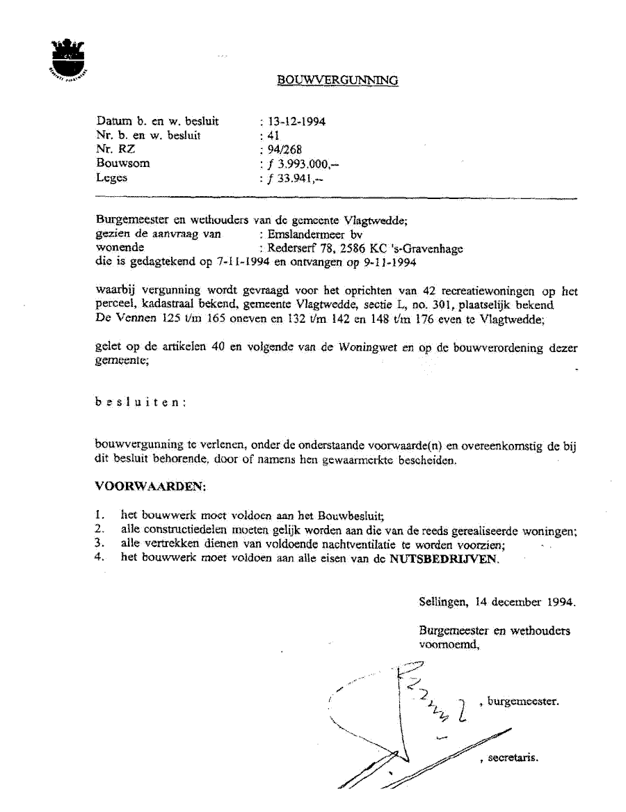Bouwvergunning Burgemeester en Wethouders van Vlagtwedde m.b.t. De Vennen