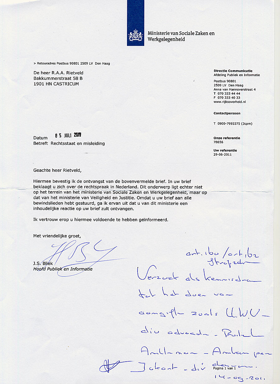 Aan alle volksvertegenwoordigers, ministers, justitiële en politieambtenaren, mijn verslag van overheidsfraude in de brief aan minister Opstelten over binnenvallen van politie in opdracht van de Officier van Justitie. Zie Deel I en Deel II van het interview, waarin misbruik van bevoegdheden en manipulatie met boze opzet verklaard worden. Deel III kan aanleiding zijn voor een kabinetscrisis omdat de ministers Donner en Verhagen verantwoordelijk zijn voor de uitwassen bij het UWV, het CJIB, de ambassade in Jakarta en het beleid voor Justitie en Buitenlandse Zaken. N.B.: Alle uitlatingen vallen strikt onder de verantwoordelijkheid van Ir. R.A.A. Rietveld.