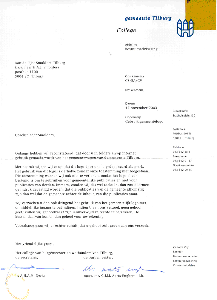 Geachte Nederlanders, de heer Hans Smolders is het verboden om een afgeleide in zijn loge (klein gedeelte) van het Gemeente Wapen van Tilburg op zijn website www.lijstsmolders.nl te gebruiken, zie bijgevoegde brief van de "LOGO" Burgemeester van Tilburg mevrouw Mr. C.J.M. Aarts-Engberts l.b. (Loco burgemeester). Zoals ook Balkenende en Donner niet bezig zijn met de vreselijke toestand in Nederland, Balkenende heeft het "oranje" virus en Donner vergeet voor het gemak maar meer dan de helft van de 48 aanbevelingen tegen terrorisme, maakt ook deze "LOGO" Burgemeester van het CDA (Christus Deed Anders) en verantwoordelijk voor de veiligheid van Tilburg, wel de moordstad nummer 1, zich als haar grote voorgangers druk over futiliteiten. Je zult maar zo'n bestuurder hebben die voor de veiligheid van haar burgers moet zorgen. Er bestaat een virus in Nederland. Het virus dat zich een weg baant door alle politieke, bestuurlijke en establishment niveaus in Nederland, het virus dat niets anders doet dan verwarring zaaien in de waarheid. Hier is geen enkele virusscan tegen opgewassen want het zit in de eigen CVE (Centrale Verwerkings Eenheid oftewel hun hersenen) van deze bestuurders en er bestaat jammer genoeg nog geen enkele link om deze grootste aanslag op de echte politieke/bestuurlijke/establishment waarheid te herstellen! Help Hans Smolders, wordt lid en sta open voor echte verandering in Nederland. Hartelijke Groeten, Paul Quekel Sr. |