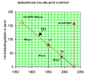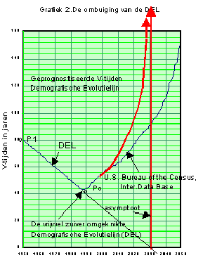 De zwarte naar de toekomst doorgetrokken Demografische Evolutielijn DEL laat zien dat de asymptoot omstreeks 2030 is gelegen. Natuurlijk kan de DEL niet tot 2030 doorlopen, omdat de verdubbelingtijd dan nul zou worden en dat betekent een oneindig grote groei, wat onmogelijk is. Daardoor weten wij dat de Demografische Evolutielijn ergens voorafgaand aan 2030 moet ombuigen. Toen ik de DEL in 1987 vond waren er nog niet voldoende statistieken bekend en wist ik nog niet waar de DEL zou ombuigen. Op de volgende grafiek kunnen wij zien dat de Demografische Evolutielijn in 1987 asymptotisch is omgebogen. Door de grote massatraagheid van de wereldbevolking is dat gebeurd ongeveer 47 jaar voorafgaand aan de asymptoot. (2030) Dat is veel eerder dan de ombuiging van de Kapitaal Evolutielijn die in 1998 is omgebogen en dat was twee jaar voorafgaand aan de asymptoot (2000). Dit zal worden besproken bij het hoofdstuk Kapitaal.