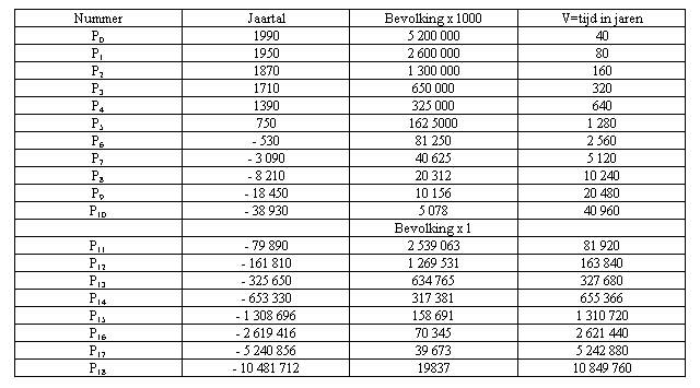 Volgens de eerste officiële statistieken bedroeg de wereldbevolking in 1870 ongeveer 1300 miljoen. In 1950 was dit aantal verdubbeld tot ongeveer 2600 miljoen. In 1987 kort na de aanvang van mijn studie, zag het er naar uit dat de bevolking in 1990 ongeveer 5200 miljoen zou bedragen. Uit deze getallen blijkt dat tussen 1870 en 1950 de bevolking verdubbelde en de daarvoor benodigde (verdubbeling)tijd 80 jaar bedroeg. Voorts zien we dat de bevolking tussen 1950 en 1990 weer verdubbelde, waarvoor maar (ongeveer) 40 jaar voor nodig was. Deze getallen behoren tot de meetkundige reeks: 40-80-16-320-640-enz. Later is gebleken dat die meetkundige reeks van de verdubbelingtijden in 1987 ten einde is gekomen, zoals verder zal worden besproken