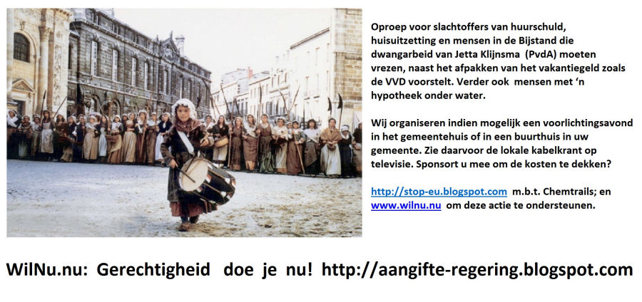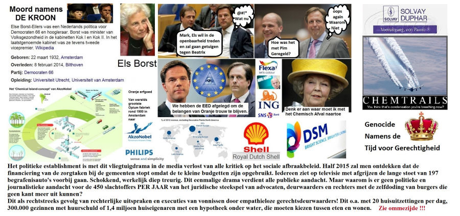 Het politieke establishment is met dit vliegtuigdrama in de media verlost van alle kritiek op het sociale afbraakbeleid. Half 2015 zal men ontdekken dat de financiering van de zorgtaken bij de gemeenten stopt omdat de te kleine budgetten zijn opgebruikt. Iedereen ziet op televisie met afgrijzen de lange stoet van 197 begrafenisauto's voorbij gaan. Schokkend, werkelijk diep treurig. Dit eenmalige drama verdient alle publieke aandacht. Maar waarom is er geen politieke en journalistieke aandacht voor de 450 slachtoffers PER JAAR van het juridische steekspel van advocaten, deurwaarders en rechters met de zelfdoding van burgers die geen kant meer uit kunnen? Dit als rechtstreeks gevolg van rechterlijke uitspraken en executies van vonnissen door empathieloze gerechtsdeurwaarders! Dit o.a. met 30 huisuitzettingen per dag, 300.000 gezinnen met huurschuld of 1,4 miljoen huiseigenaren met een hypotheek onder water, die moeten kiezen tussen eten en wonen….! Die JAARLIJKSE stoet lijkwagens is twee keer zo lang als die van de vliegtuigramp. Is het niet zinnig om ook op de stoep voor het Gerechtsgebouw in Den Haag en voor de deur van de Tweede Kamer een bloemenzee te laten ontstaan, als blijk van medeleven en respect voor diegenen die het leven zijn ontvlucht vanwege het overheidsbeleid dat niet meer te verdragen was? Zie: www.sdnl.nl/stidag.htm en http://volkstribunaal.vrije-mens.org en http://ommekeer-nederland.nl en http://wilnu.nu, en gebruik de mailinglijsten © Met vriendelijke groet,