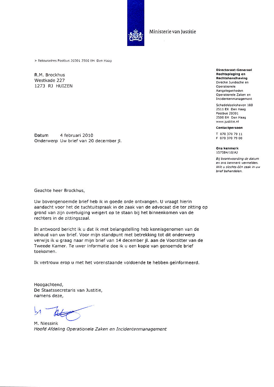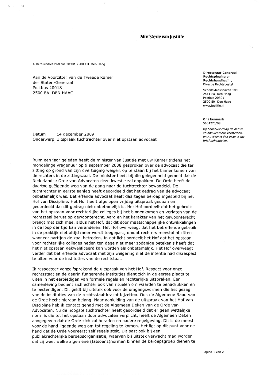Met verbazing en afkeer heb ik (en vele Nederlanders met mij) kennis genomen van uw voornemen om het opstaan voor de rechter middels een wettelijke regeling af te dwingen. Dit in de context van het debat rondom de advocaat Mohammed Enait die, in mijn optiek terecht weigert op te staan voor de rechter. Hoewel zijn motivatie voor het weigeren op te staan wellicht wat anders is dan de mijne, denk ik dat het in de kern neerkomt op een enkel gegeven: respect.