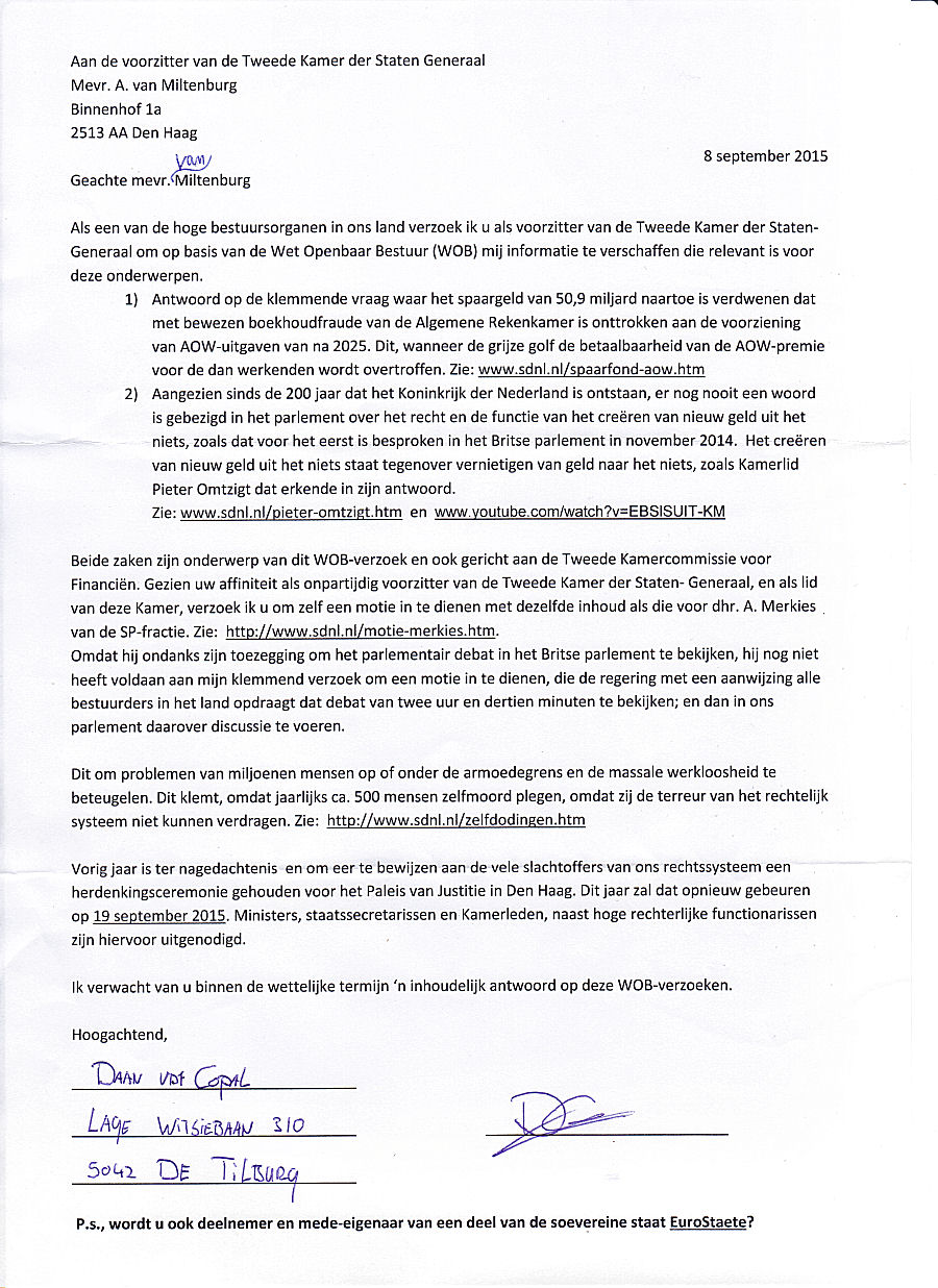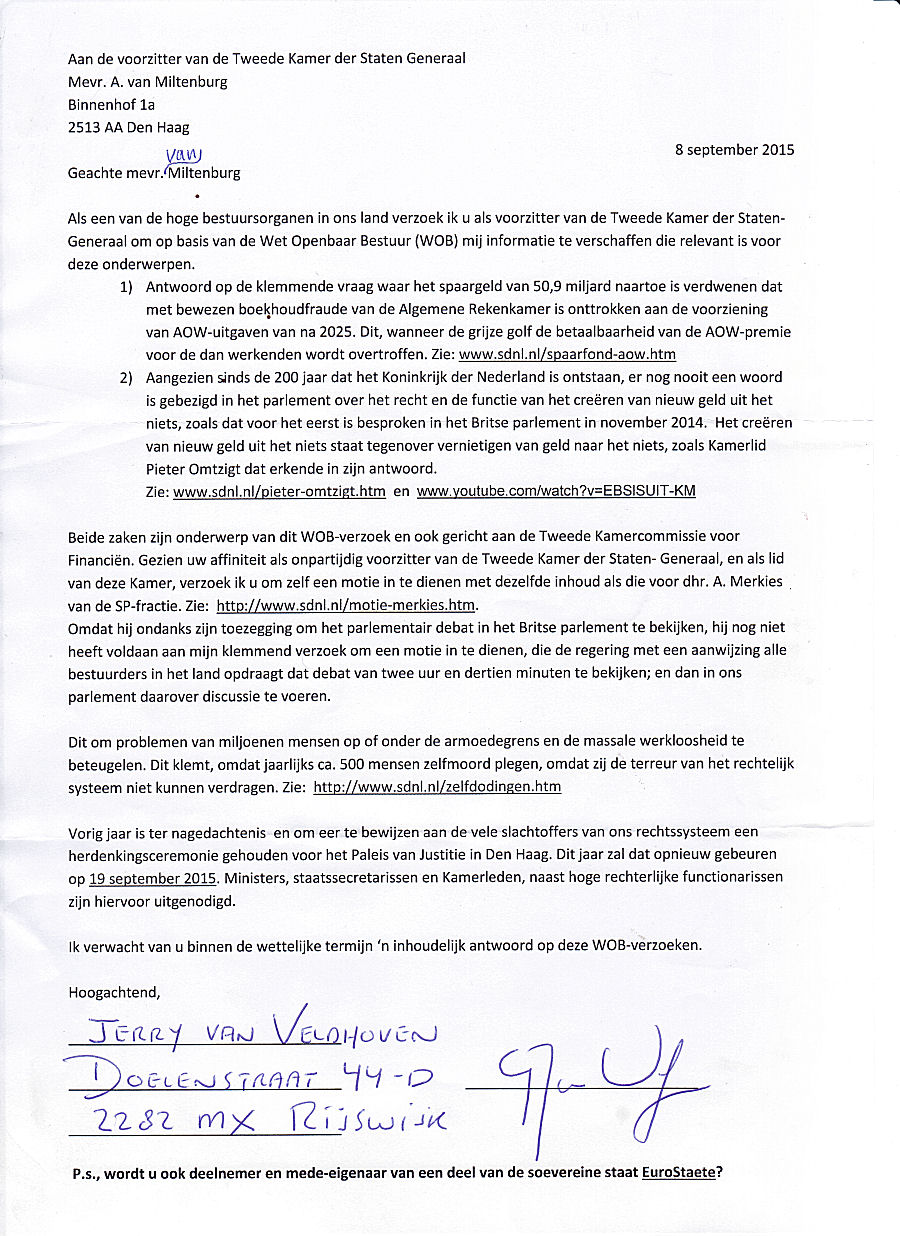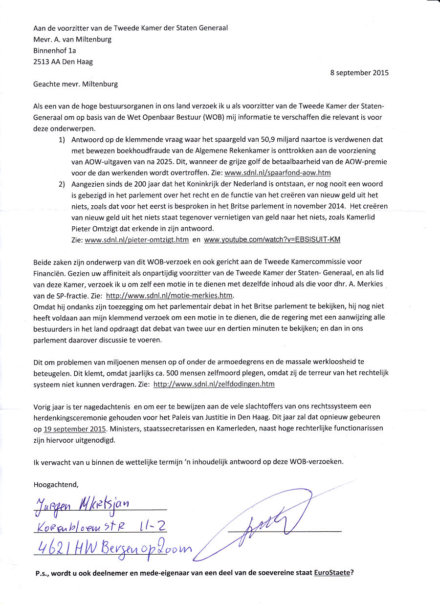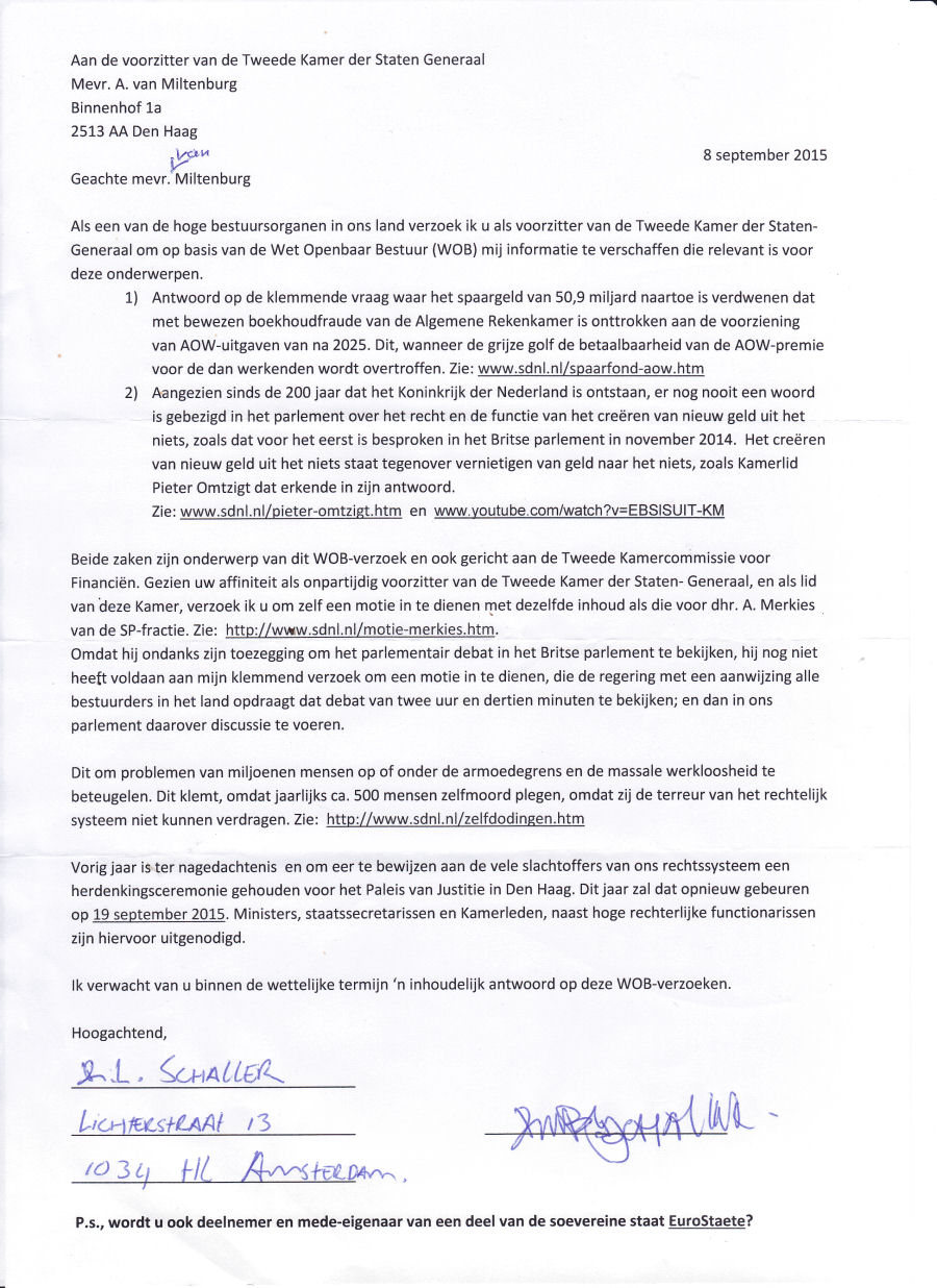 Beide zaken zijn onderwerp van dit WOB-verzoek en ook gericht aan de Tweede Kamercommissie voor Financiën. Gezien uw affiniteit als onpartijdig voorzitter van de Tweede Kamer der Staten- Generaal, en als lid van deze Kamer, verzoek ik u om zelf een motie in te dienen met dezelfde inhoud als die voor dhr. A. Merkies van de SP-fractie. Zie: www.sdnl.nl/motie-merkies.htm. Omdat hij ondanks zijn toezegging om het parlementair debat in het Britse parlement te bekijken, hij nog niet heeft voldaan aan mijn klemmend verzoek om een motie in te dienen, die de regering met een aanwijzing alle bestuurders in het land opdraagt dat debat van twee uur en dertien minuten te bekijken; en dan in ons parlement daarover discussie te voeren. Dit om problemen van miljoenen mensen op of onder de armoedegrens en de massale werkloosheid te beteugelen. Dit klemt, omdat jaarlijks ca. 500 mensen zelfmoord plegen, omdat zij de terreur van het rechtelijk systeem niet kunnen verdragen. Zie: zelfdodingen.htm Vorig jaar is ter nagedachtenis en om eer te bewijzen aan de vele slachtoffers van ons rechtssysteem een herdenkingsceremonie gehouden voor het Paleis van Justitie in Den Haag. Dit jaar zal dat opnieuw gebeuren op 19 september 2015. Ministers, staatssecretarissen en Kamerleden, naast hoge rechterlijke functionarissen zijn hiervoor uitgenodigd. Ikzelf en alle anderen verwachten van u binnen de wettelijke antwoordtermijn een inhoudelijk antwoord op deze WOB-verzoeken. Hoogachtend,