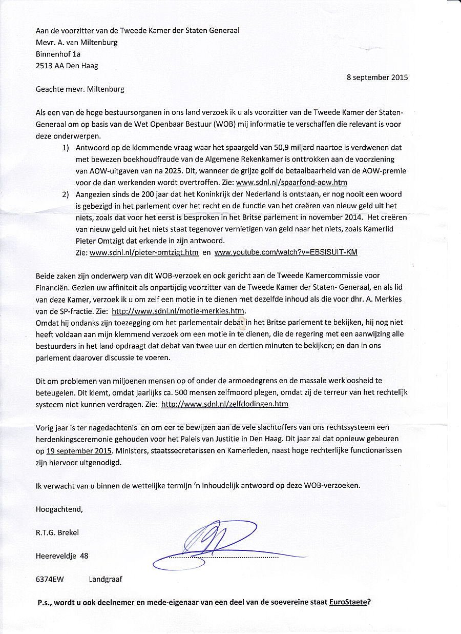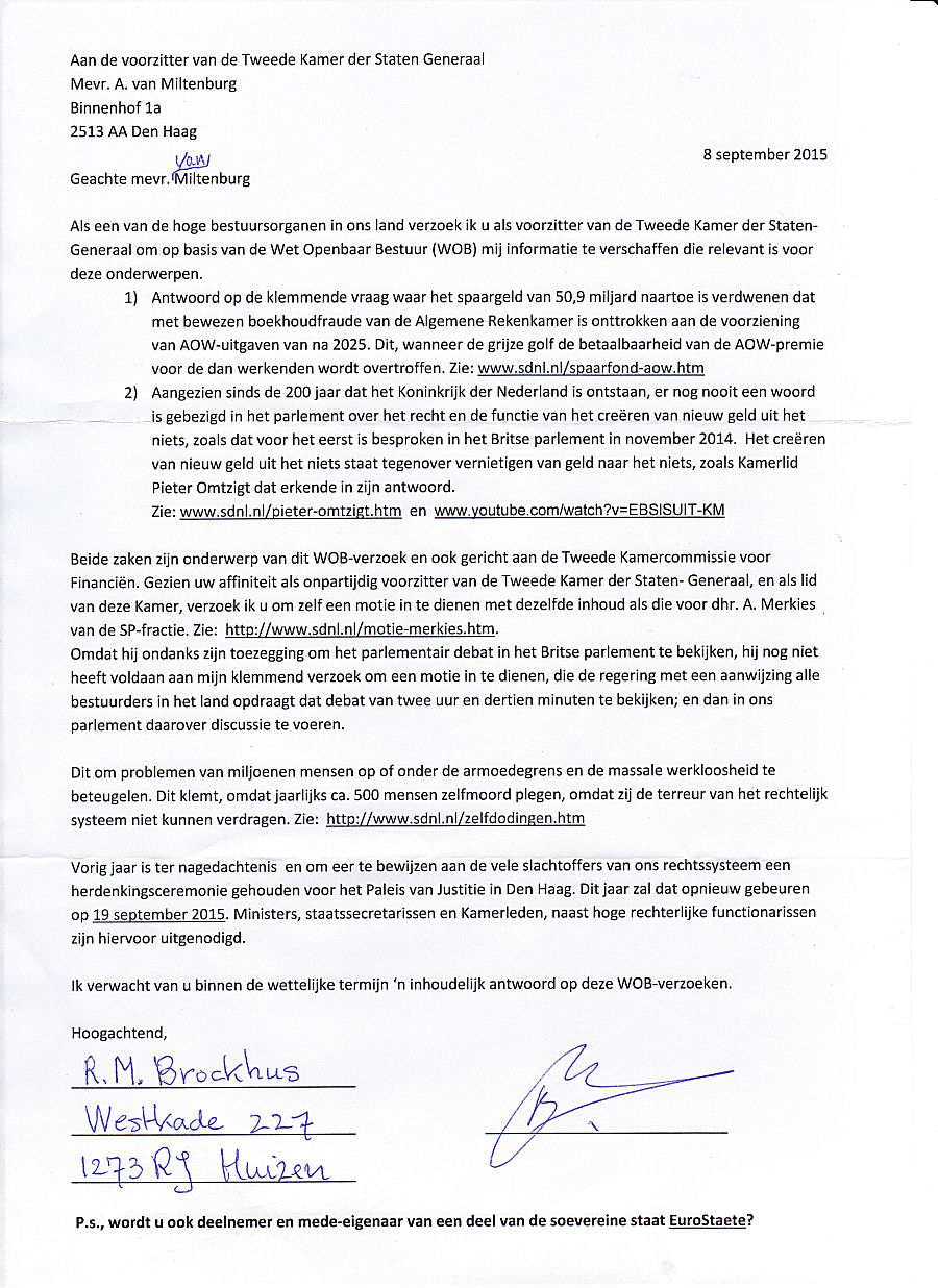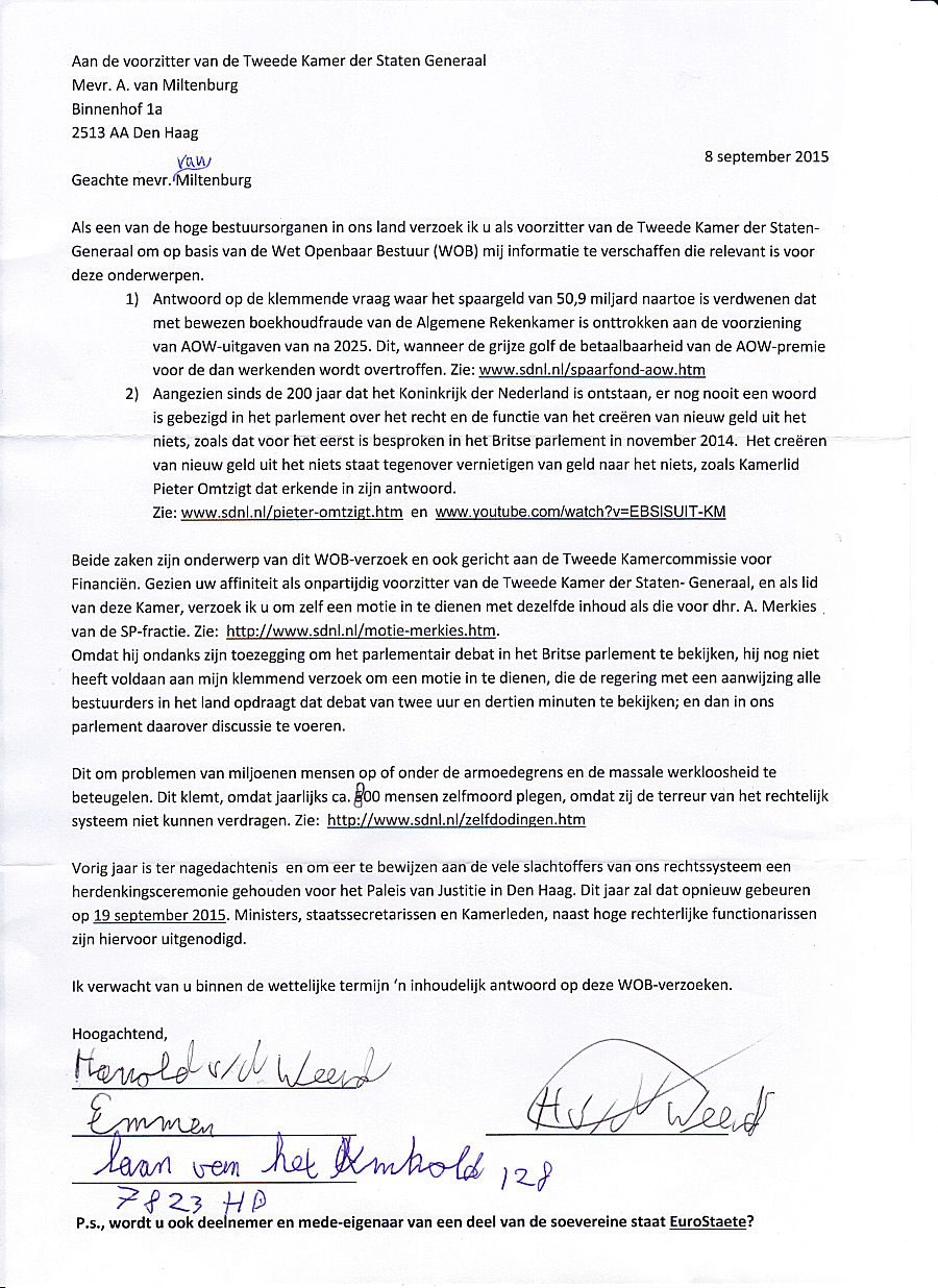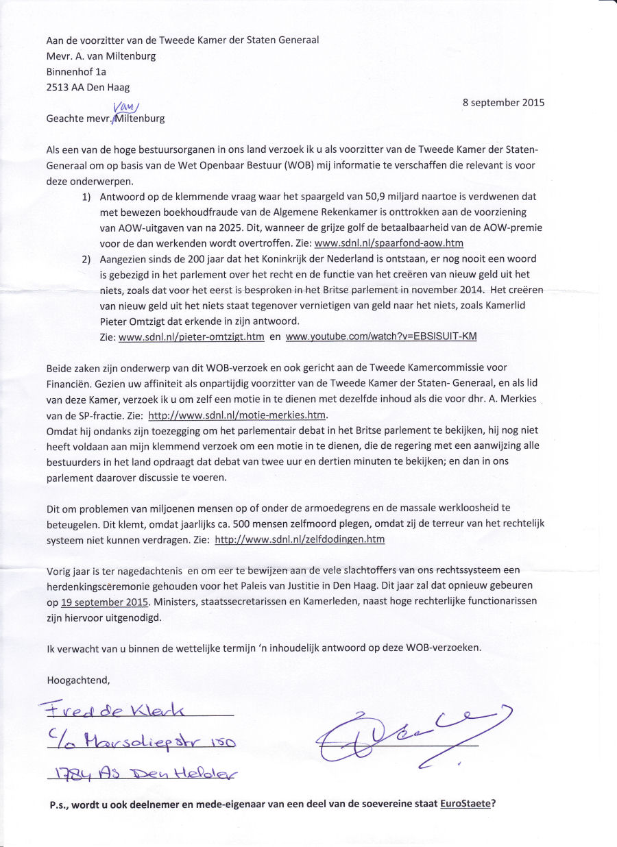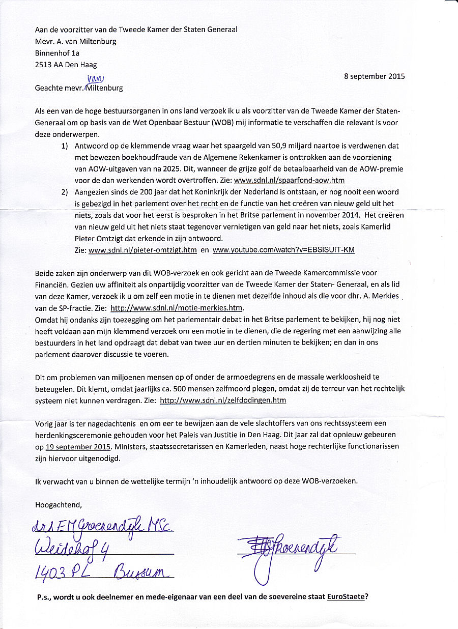 Beide zaken zijn onderwerp van dit WOB-verzoek en ook gericht aan de Tweede Kamercommissie voor Financiën. Gezien uw affiniteit als onpartijdig voorzitter van de Tweede Kamer der Staten- Generaal, en als lid van deze Kamer, verzoek ik u om zelf een motie in te dienen met dezelfde inhoud als die voor dhr. A. Merkies van de SP-fractie. Zie: www.sdnl.nl/motie-merkies.htm. Omdat hij ondanks zijn toezegging om het parlementair debat in het Britse parlement te bekijken, hij nog niet heeft voldaan aan mijn klemmend verzoek om een motie in te dienen, die de regering met een aanwijzing alle bestuurders in het land opdraagt dat debat van twee uur en dertien minuten te bekijken; en dan in ons parlement daarover discussie te voeren. Dit om problemen van miljoenen mensen op of onder de armoedegrens en de massale werkloosheid te beteugelen. Dit klemt, omdat jaarlijks ca. 500 mensen zelfmoord plegen, omdat zij de terreur van het rechtelijk systeem niet kunnen verdragen. Zie: zelfdodingen.htm Vorig jaar is ter nagedachtenis en om eer te bewijzen aan de vele slachtoffers van ons rechtssysteem een herdenkingsceremonie gehouden voor het Paleis van Justitie in Den Haag. Dit jaar zal dat opnieuw gebeuren op 19 september 2015. Ministers, staatssecretarissen en Kamerleden, naast hoge rechterlijke functionarissen zijn hiervoor uitgenodigd. Ikzelf en alle anderen verwachten van u binnen de wettelijke antwoordtermijn een inhoudelijk antwoord op deze WOB-verzoeken. Hoogachtend,