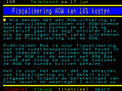 De druk op de arbeidsvoorwaarden met loondaling als gevolg voor werknemers met handarbeid zal hoogstwaarschijnlijk ook de afdracht van AOW-premie doen verminderen, zodat er dan nog meer gesneden zal gaan worden in de koopkracht van gepensioneerden en werkenden. Er zijn daarvoor gelukkig wel twee oplossingen gevonden. Namelijk de Algemene Wet Inkomensvoorziening gekoppeld aan de Koopkracht Pariteiten Belasting, zoals dat in het verkiezingsprogramma van de Sociale Volks Partij is voorgesteld. Met een speurtocht over het internet naar het bedrag dat de Sociale Verzekeringsbank uitkeert aan AOW blijkt dat die informatie kennelijk zo gevoelig ligt, dat nergens een concreet getal te vinden is. Niet bij het CBS, niet bij DNB, niet bij het CPB, niet bij ABP en zelfs niet bij de dagbladen. Alleen over het spaarfonds voor de AOW zijn voldoende artikelen te vinden. Vreemd, dat informatie over een van de allerbelangrijke uitgaven van de staat niet te vinden is. Ook Google geeft alleen maar oude informatie, wat is hier aan de hand ?? We willen die informatie namelijk koppelen aan de statistiek die bij de SDN tot 1999 loopt. Zie de rijksbegroting uit 2002 en het spaarsaldo eind 2005 dat van de overheidsschuld of staatsschuld moet worden afgetrokken, omdat het de inkoop betreft van eigen obligaties van de Staat der Nederlanden, en dus een veel lagere UMU-schuldquote resteert die misleidend kunstmatig hoog gehouden wordt, en zonder dat er vragen worden gesteld in relatie tot de betaalbaarheid van de AOW op lagere termijn. De bedoeling van deze leugen om bestwil is duidelijk, wanneer het betaalbaarheidsprobleem niet meer bestaat, dan is het bezuinigen op de koopkracht van de mensen met een (AOW) uitkering niet meer te verkopen. En dus zwijgt iedereen in de Tweede kamer, inclusief de PvdA, GroenLinks en de SP. Zelfs de Christen Unie laat de leugen gewoon passeren. Zie hiervoor een satirische kritiek op Andries Knevel die op 30 september 1996 met de inmiddels overleden Wim Bosboom keuvelde over de AOW. Knevel durft overigens nog steeds niet de monetaire politiek ter discussie te stellen in zijn programma. Waar ook niemand over praat is dat vanwege de hogere inkomens van de gepensioneerden er nu al een grotere opbrengst voor de fiscus in het verschiet ligt. Niet alleen vanuit de finale bestedingen (met BTW, inkomsten- en winstbelasting) die werk verschaffen aan de nog niet gepensioneerden en uitkeringen beperken, maar ook dat met het daarop volgende grote sterven ook het grote erven begint; en successierechten de eventueel opgebouwde fiscale tekorten zullen laten wegsmelten als sneeuw voor de zon, waarbij overschotten op de begroting niet uitgesloten zijn. De VVD zal er voor waken dat die overschotten zullen voorkomen met belastingverlagingen voor de hoge inkomens, zoals nu ook het geval is. Het CDA van Balkenende volgt Gerrit Zalm die de vruchten van zijn sloopbeleid zal kunnen plukken met een miljoenensalaris bij vermoedelijk de ABN-Amrobank, omdat hij zijn klus heeft afgemaakt; verschrijvingen van een half miljard in de ziekenhuizen bagatelliserend. |