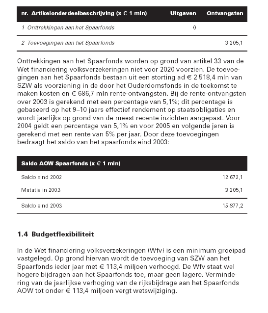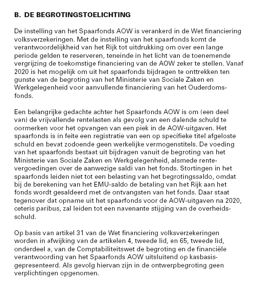 Een centraal punt in hun kritiek op het WRR rapport vormt het gegeven dat het AOW spaarfonds reeds de nodige waarborgen biedt voor de komende vergrijzing. Op zich is dat waar, maar wel moet worden bedacht dat dit fonds alleen maar werkt wanneer de overheidsfinanciën op orde zijn. Het AOW spaarfonds wordt gevoed uit middelen van de rijksoverheid. Normaal gesproken zouden die middelen hebben kunnen leiden tot een directe verlaging van de staatsschuld. Door echter deze middelen af te zonderen voor het fonds ontstaan extra waarborgen voor de financiering van de oudedagsvoorziening later. Volgens de gangbare definities leiden stortingen in het AOW fonds tot een lager EMU tekort en een lagere EMU schuld.