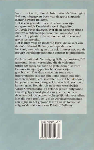 Mededeling van het bestuur van de Bellamy StichtingMededeling van het bestuur van de Bellamy StichtingOp het internet zijn ook anderen actief met het gedachtegoed van Edward Bellamy. Zij verspreiden verkeerde informatie, ook over ons zoals de namen van personen die bestuursleden van de Internationale Vereniging Bellamy zouden zijn, zij zijn echter door de IVB in 2003 voor het leven geroyeerd overeenkomstig de toen geldende statuten van de IVB. In verband met de vergaande vergrijzing van de IVB en de veranderde maatschappelijke omstandigheden, het hoge tempo waarin veranderingen plaatsvinden, is de vereniging in 2005 omgezet in een stichting om ook snel met actie op de veranderingen te kunnen reageren, hetzij ondersteunend, hetzij protesterend. De stichting is ingeschreven bij de Kamer van Koophandel in Enschede. De vraag was ook hoe met zo'n kleine vergrijsde vereniging omgaan met de ontketening van de Grote Omwenteling; wat kan die vereniging eigenlijk nog? Zij ging uit van de verouderde en onware gedachte dat de IVB er zou zijn om de wereldrevolutie te ontketenen, maar dat was nooit de waarheid, Edward Bellamy heeft deze IVB daarvoor niet gesticht, immers hij was toen al 34 jaar dood en lijken ontketenen nou eenmaal geen wereldrevoluties. De waarheid is altijd wel geweest dat de IVB er sinds 1932 was en is om het gedachtegoed, dat Edward Bellamy vastlegde in zijn boeken, uit te dragen, levend te houden en dat is precies wat wij doen. Inmiddels zijn er drie boeken uitgegeven via uitgeverij Boekenplan, zie www.boekenplan.nl. Deze drie boeken zijn samengesteld en bewerkt voor de moderne tijd door Bram Snoek, de onderzoeksschrijver die ook als voorzitter van de IVB heeft gefungeerd. Voor zijn eigen boeken zie ook de website www.boekenplan.nl. De boeken zijn ook in de boekhandel verkrijgbaar. Titels: