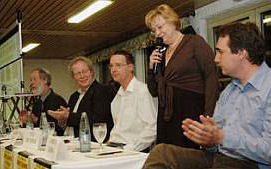 gehouden in de 'Gelagkamer' van Zaal Staring, Uw aanwezigheid wordt bijzonder op prijs gesteld. Wilt U komen dan verzoeken wij U zich aan te melden via mail: p.freriks@chello.nl of tel.: 06-10897675 of per brief: Piet Heinstraat 19, 6904 AL Zevenaar. Met vriendelijke groeten, Comité: 'Laat de Betuwelijn varen' en Werkgroep 'Ontbielzen', Namens deze, Wim Slinger en Paul Freriks. Programma: *. Opening door gespreksleider Paul Freriks met voorstellen gasten. *. Inleiding door de Tafelgenoten: - Han de Bruin, vervoersdeskundige en publicist: "Wat staat de Duitsers te wachten." - Koen IJff,veiligheidsadviseur, met een inleiding over de veiligheidsaspecten. - Wouter Leeuwenburgh, ir. En ex-medewerker Verkeer en Waterstaat: 'Kunnen we nog iets met die Betuwelijn? - Emile Roemer, Tweede Kamerlid SP (V.en W.): 'Wat is de politieke stand van zaken en wanneer kunnen we een parlementaire enquête verwachten.' *. Aanvullingen uit de zaal. *. Pauze. *. Discussie met de zaal. *. Wat verder ter tafel komt. ('Een zowel Nederlands als Duitse rechtsvorm om te kunnen procederen) *. Sluiting. Als deskundigen zijn in de zaal aanwezig: Michiel Roscam Abbing (auteur van het boek: Hoe spoort het water i.s.m. Richard H. van der Pols en M. Bierman) ; Koen IJff (veiligheidsdeskundige); Wouter Leeuwenburg (ir. en oud-medewerker V.en W. en red. Zwartboek Betuweroute) ; Axel Bolhuis (idem), Henk aan der Wiel (geluidsdeskundige), Wim Slinger (Lid cie. "Laat de Betuwelijn Varen); Emile Roemer (Tweede Kamerlid SP met portefeuille V. en W.); Wim Sweers (Voorzitter Grondvest) ; Rob Brockhus (Hoofdredacteur SDN); Han de Bruin, publicist en vervoersdeskundige; Richard H. van der Pols; historicus; J. Laarakker, coördinator anti-Betuwelijngroep uit Emmerich; Linda De Neve, Sociaal Zevenaar; Lies Visscher, bioloog en coördinator economische doorberekening kosten exploitatie Betuwelijn, Lau Wachters (auteur van de nota "De Betuwelijn, Wist u dat?" ) en Paul Freriks. (namens SZ, "Laat de Betuwelijn Varen en Ontbielzen") |