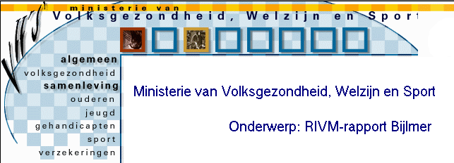 ![]() Datum: 1998-11-05, Nummer: 94 RIVM-rapport over gezondheidsrisico's vliegtuiglading BijlmerrampMinister Borst van Volksgezondheid, Welzijn en Sport heeft vandaag het rapport Gezondheidsrisico's Brand El Al-Boeing verstuurd aan de Tweede Kamer. Dit rapport is op verzoek van de Inspectie voor de Gezondheidszorg opgesteld door het Rijksinstituut voor de Volksgezondheid en Milieu (RIVM).In het rapport staan de resultaten van het RIVM-onderzoek naar mogelijke gezondheidsrisico's van stoffen en goederen aan boord van de El-Al Boeing die op 4 oktober 1992 verongelukte in de Bijlmer. De Hoofdinspecteur voor de Gezondheidszorg, J. Verhoeff, heeft het RIVM-rapport tevens toegezonden aan de onderzoeksgroep van het AMC die de gezondheidsklachten onderzoekt die door patiënten in verband worden gebracht met de Bijlmerramp. Een samenvatting van het rapport is bijgevoegd.