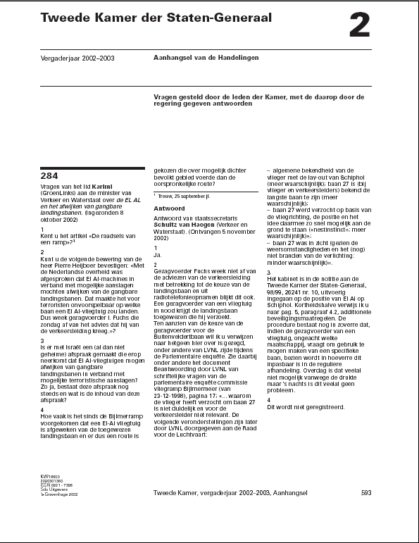 Onwaarheden in antwoord staatssecretaris op kamervragen Staatssecretaris M.H. Schultz van Haegen van Verkeer en Waterstaat gaat voort op de weg die, waar het de Bijlmerramp betreft, eerder is bewandeld door de ministers Maij-Weggen en Jorritsma. In haar antwoord op kamervragen wordt het parlement aantoonbaar 'onjuist voorgelicht' - anders gezegd: domweg belogen. In dat antwoord (gedateerd 5 november 2002) op vragen van het kamerlid Karimi van GroenLinks schrijft de staatssecretaris onder meer: 'Gezagvoerder Fuchs week niet af van de adviezen van de verkeersleiding met betrekking tot de keuze van de landingsbaan en uit radiotelefonieopnamen blijkt dit ook.' Dit is een schaamteloze leugen. Niet alleen heeft de verkeersleiding van Schiphol talloze malen met nadruk laten weten dat Fuks (zo dient zijn naam gespeld te worden) wel degelijk is afgeweken van het advies van de verkeersleiding om op baan 06 van de luchthaven te landen; de nog bestaande geluidsbanden bewijzen dit ook. In een 'Analyse van de afhandeling van El Al 1962', die in september 1993 ten behoeve van de Raad voor de Luchtvaart is opgesteld door de Commissie Vliegongeval van de Luchtverkeersleiding (toen nog LVB geheten), worden gesprekken die op deze geluidsbanden staan aangehaald. Op pagina 2 van de analyse citeert de Commissie Vliegongeval de verkeersleider die om 18.28 uur Nederlandse tijd contact heeft met het El Al-vliegtuig. De verkeersleider zegt: 'Roger, heading 270 for downwind.' Dit kan maar één betekenis hebben: de verkeersleiding geeft de El Al-bemanning het advies om een bepaalde koers te vliegen. De Commissie Vliegongeval schrijft hier als toelichting bij: 'De koers 270 was bedoeld voor downwind baan 06 (hoofdlandingsbaan).' Dit kan maar &ecacute;&ecacute;n ding betekenen: de El Al-bemanning kreeg van de luchtverkeersleiding het advies aan te sturen op een landing op baan 06. De El Al-co-piloot vraagt even later (pagina 3 van de analyse): 'What will be the runway in use for me at Amsterdam?' De verkeersleiding antwoordt: 'Runway 06 in use sir, surface wind 040 at 21 knots, QNH 1012.' Dit betekent dat de verkeersleiding er nog steeds van uitgaat dat de gezagvoerder zal kiezen voor de door de verkeersleiding geadviseerde landingsbaan 06. De gezagvoerder laat immers letterlijk vragen: 'Welke baan is voor mij in gebruik?'. En de verkeersleiding zegt opnieuw: 'Baan 06.' Om 18.29 uur zegt de bemanning van het El Al-toestel: 'We request 27 for landing.' Dit kan maar &ecacute;&ecacute;n ding betekenen: de bemanning wijkt af van het advies van de verkeersleiding om op baan 06 te landen. Tijdens zijn openbare verhoor door de parlementaire enquêtecommissie zei verkeersleider E.H. ter Braake daarover onder meer (bijlage 3A bij het eindrapport van de commissie, bladzijde 147): 'Hij vroeg dus zelf om baan 27. Dat hoorde ik op dat moment voor het eerst. Ik reageerde: 27? Dat klopt niet. Maar hij wilde baan 27. (_) Hij heeft dan de wind van achteren in plaats van op zijn neus. De normale gang van zaken is dat je landt en start met de wind op de neus en niet in de staart.' Wat Ter Braake hier aanduidt is: baan 27 klopte niet, want de verkeersleiding zou hem baan 06 hebben moeten adviseren - en dat had de verkeersleiding ook gedaan.