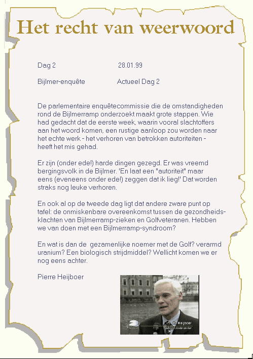 P. Veen (politieman) Geboren: 04-05-1965 De heer Veen was de eerste politieman ter plaatse van het Bureau Ganzenhof en was ooggetuige van het neerstorten van de Boeiing van El Al. Hij zag niet alleen dat de twee rechter motor van het vliegtuig waren verdwenen, maar zag ook dat de twee andere motoren in brand stonden, zowel aan de voor- als aan de achterkant. Het feitelijk inslaan zag hij niet omdat hij met zijn collega's dekking had gezocht in een van de garages in de buurt. De gigantische vuurbal die na de inslag opsteeg gaf hem de zekerheid dat een grote operatie voor hulpverlening en coördinatie van hulpdiensten moest worden gestart. Hij had aan de commissie gemeld dat de communicatie niet optimaal was. Hij was hoed op de hoogte van de plaatselijke situatie. Het voetgangersgebied van het 'dreefnivau' dat boven het maaiveldniveau ligt vereist een speciale coördinatie. Hij melde ook dat hij de mensen in de Witte pakken niet gezien, omdat hij aan de andere kant aanwezig was. Hij had wat betreft de witte kleding op dat moment geen specifieke aandacht geschonken. Voor zover hij weet dacht hij dat mensen in het wit tot de hulpverleners behoorden. De brandweer stond volgens hem bij het Winkelcentrum Kraaiennest. Vanaf het moment dat hij de coördinatie niet meer voerde is hij praktisch aan het werk gegaan en ging daar voor de flat binnen. Hij gaf daarna aan ernstig ziek te zijn, door dat de lichamelijke klachten na de ramp. Die klachten waren niet toe te schrijven aan de eerder ziekte van Pfeiffer. Het leek alsof er iets met zijn bloed aan de hand was. Het voelde aan alsof zijn bloed 'kookte'. Allerlei klachten kwamen tot uiting die niet te verklaren waren. Vooralsnog legde hij het verband niet met de Bijlmerramp, maar nu denkt hij daar anders over. Zijn collega's vertonen inmiddels ook allerlei lichamelijke ongemakken.