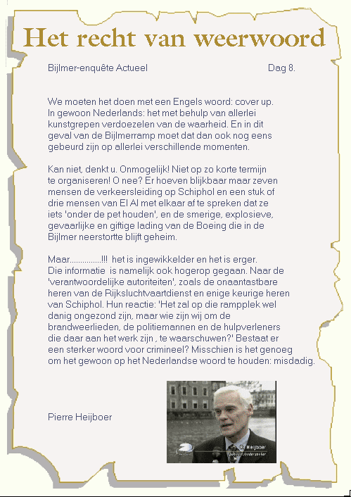 De geestelijk impact van de crash was extreem. Het is een echte nachtmerrie. Je werk je hele leven aan de techniek om te voorkomen dat er ongelukken gebeuren, dan leidt een crash tot geestelijke nood en heb je hulp nodig. El Al heeft ons geadviseerd om de bedrijfsarts te bezoeken. Ik denk over het onderhoud bij El Al dat dat in het algemeen goed is. De werkdruk was in sommige gevallen wel heel erg hoog. Meestal met twee mensen in een ploeg en drie of vier vliegtuigen per dag. De zomers en winters zijn verschillend. We doen er 120 in de zomer, en de winter 180. Mijn beoordeling van het onderhoud was achteraf dat wij niets méér hadden kunnen doen dan dat we gedaan hebben. Ik weet dat ik onder ede sta, en wil eerst overleg met mijn advocaat over de vraag of er wel eens onregelmatigheden plaats vonden bij het onderhoud van de El Al toestellen. Ik wil nu hierop pas antwoorden omdat ik eerst iets met u wil bespreken. Er zijn zaken die ik gehoord heb maar vind het niet verstandig om dat hier nu te doen. Over de vrouwelijke passagiere zeg ik u, ik zei dat ik niet wist dat dat mensen "ongeregistreerd" meevlogen. Maar in mijn eerdere verklaring vermeldde ik dat er "geautoriseerde" personen wel regelmatig meevlogen met toestemming van Tel Aviv. Dus ook bij El Al gebeurde dat regelmatig. Of mensen al dan niet op de passagierslijsten voorkwamen weet ik niet. Men moet weten na een crash hoeveel mensen er aan boord waren. De persoonlijke verhoudingen op het werk waren niet altijd goed. Ik had een conflict met de maintenance-manager na de crash (mr. Dash). Er moesten onderhoudspapieren afgetekend worden. Het is nooit gebeurd dat ik niet tekende en anderen wel. Het kwam voor - gehoord - dat het bij collega's wel is gebeurd. Ik heb dat vier of vijf keer gemerkt. Mensen zouden eigenlijk niet hebben willen tekenen maar moesten dat in opdracht. Dat gold dan alleen voor vrachttoestellen.