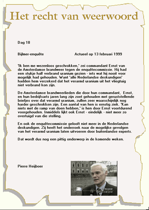 De Heer te Broekhorst verklaart een paar uur na de ramp metingen te hebben gedaan op gevaarlijke stoffen en ook uranium met meters daarvoor. Werkten die meters dan wel omdat er wel degelijk uranium aanwezig was in grote hoeveelheden, of hebben zij op de verkeerde plekken gemeten. Weet een chemicus wel waar hij over praat als het om Uranium gaat? Nee, want er schijnt geen kennis op dit gebied te zijn in Nederland.