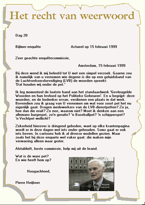 De heer H.G. Damveld Geboren: 24-07-1945 Ik had de leiding als manager van het luchtvaartonderzoek van de Rijksluchtvaartdienst in Hangar 8. Ik moest specifiek het strafrechtelijk onderzoek leiden met 6 à 7 medewerkers. Ik hoorde van het neerstorten van de Boeing. Iets na half zeven onder Studio Sport. Het was een kwartiertje rijden naar Schiphol. Voor mij was het duidelijk wat ik zou moeten doen. Ik weet niet meer welke personen er aanwezig waren. Er waren veel politiemensen op de been. Het feit dat ik de namen niet meer weet komt zowel door de tijd als door de hectiek van het moment. Het waren gewoon bekenden van mij. (De andere waarheid) De leiding had op dat moment de heer Bloemen. Hij was mijn directe chef. Veel zaken heb ik weer de revue laten passeren, maar ik heb niet alles meer op het netvlies. Iedereen meldde zich om iets te kunnen doen. Naarmate de tijd vorderde kwam er meer structuur in. De mensen van de Dienst Luchtvaart wisten in grote lijnen wel wat hun taak was. Een of twee marechaussees waren in gestroomd. Er is geen discussie over geweest. De afd. luchtvaartonderzoeken had tot taak om vast te stellen of er strafrechtelijke aspecten waren. Ik kreeg van diverse afdelingen uit het land versterking. De vraag van de RLD weet ik niet meer. De inhoud van dat verzoek kan ik mij niet meer herinneren. Wel is er gesproken over hangar elf. Maar ook over hangar acht. Later is de toewijzing gedaan om hangar acht voor de onderdelen te gebruiken. De heer Bloemen zorgde voor de beveiliging van de hangar zodat onbevoegden daarin niet binnen konden. Met de beveiliging op zich had ik niets van doen. De beveiliging was in tweeën gedeeld met plastic tussen de schroot en de klein vliegtuigen. Er was overdag een medewerker van ons voor de werkgroep van de heer Pruis.