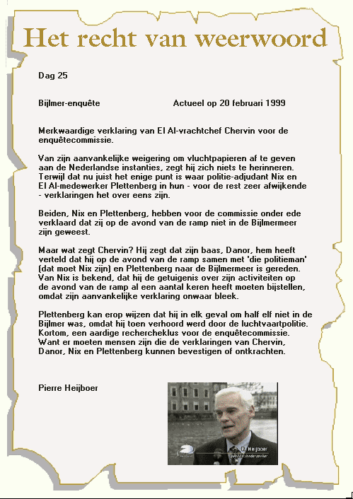 Geboren: 13-03-1956 Ik werd gebeld door mijn moeder die mij op de hoogte bracht. Ik was hoofd van vliegtechnische zaken bij de luchtvaartinspectie. Met de heer Klaren heb ik overlegd. Met de BVOI heb ik geen contact gehad. Mijn bijdrage was geen enkele, behalve het inbrengen van expertise. Op maandagochtend vroeg men mij om te kijken naar de relatie tussen da lading en het ongeval. BVOI had kennelijk geen deskundigheid over de lading. De commissie-Hoekstra heeft onderzoek gedaan naar de samenstelling van de lading. Men heeft daarom bij de afdeling 'dangerous goods' geïnformeerd. Maar dat men met de heer van der Maat rond 9 uur contact heeft gehad is onjuist. De heer van der Maat heeft informatie gekregen over de notoc. Mensen van het CVO, van BVOI en de RLD hebben contact gehad met de heer van der Maat. Hij was op Schiphol voor 'dangerous goods' een bekende figuur. Met hem moest men contact opnemen over gevaarlijke stoffen. Ik raakte vanaf maandagmorgen betrokken bij de vrachtdocumentatie. Er is vermoedelijk een vergadering geweest, maar ik was daarvoor niet uitgenodigd. Ik kwam op kantoor en men heeft mij er naar gevraagd. Wat betreft 'dangerous goods' liepen de zaken via van der Maat. Van de afdeling Vliegzaken heeft niemand dan ik met de heer van de Maat contact gehad. Maandagochtend waren er vrachtdocumenten ter beoordeling. Hoe ze daar zijn gekomen weet ik niet. Misschien door de heer Beumkes gebracht. Ik woon in Den Haag, maar was om acht uur al op kantor aanwezig. De vrachtpapieren waren rond dat tijdstip ook aanwezig. Mijn kennis rond 'dangerous goods' was nihil, want ik had ze nog nooit gezien. Met de heer van der Maat zijn die papieren bekeken. De opdracht was om te kijken of er iets gevaarlijks in zat; met name radioactieve stoffen en explosieven. Naar mijn weten was dat in het kader van het vooronderzoek, en niet specifiek voor de veiligheid en voor de volksgezondheid. Die relatie lag er op die maandagmorgen nog niet. Ik had nauwelijks kennis over vrachtdocumenten. Ik heb een overzicht gemaakt met een analyse op 5 oktober. De commissie Hoekstra geeft achteraf een reconstructie van de stoffen die aanwezig waren. Bij Vliegzaken heeft men zich gebaseerd op de kennis van de heer van der Maat en van de heer Verstappen. Op basis van de conclusies van de heer van der Maat heb ik een notitie geschreven aan de heer Klaren. Uit de beschikbare gegevens bleek dat er geen radioactieve stoffen waren. Men diende m.i. rekening te houden bij het opruimen van de puin en dat er giftige stoffen aanwezig zouden kunnen zijn. Met de heer Klaren heb ik later nog gesproken over de informatie over de ramp. De memo over de restanten van giftige stoffen kwam maanden later pas boven water. De notie van mij is niet aan de heer Klaren gericht maar aan het BVOI. De afdeling Vliegzaken waar de heer Klaren verantwoordelijk was, kreeg een kopie daarvan. Het bericht was een persoonlijke notitie. Op 5 oktober hadden wij nog geen goed overzicht van de vracht. Er ontbraken nog wat vrachtpapieren. Het bestaan van gevaarlijke goederen wordt bepaald n.a.v. de notocs. De ontbrekende airway-bills moesten daarover uitsluitsel geven. De vraag was hoe aan die papieren te komen. Op dinsdag heb ik de resterende documenten opgehaald. Op die dag had ik nog geen expertise over de vrachtdocumenten. Ik kan mij niet herinneren of we gevaarlijke goederen hebben kunnen identificeren; zoals rookmelders waarin kleine hoeveelheden radioactief materiaal verwerkt is.