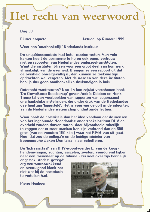 De heer H. Rengeling Geboren: ??????? Er is verarmd uranium aangetroffen en er wendden zich veel mensen tot het stadsdeelbestuur Zuidoost voor onderzoek. Op twee maniereen hebben we geprobeerd dat te doen. Ik vond deze opdracht voldoende om mee te beginnen en heb de opdracht mondeling van een aantal ambtenaren van de stadsdeelraad gekregen. Ik vond dat dat zo snel mogelijk moest gebeuren en die bestond uit twee delen 1) wat kan verarmd uranium veroorzaken; en 2) welke gezondheidsklachten komen er voor. Het stuk van de heer Keverling Buisman hebben we naast andere stukken betrokken bij het onderzoek. Wat betreft de gezondheidsklachten heb ik enkele mensen, 5, uitgenodigd om eens te komen praten. Er zijn lichamelijk geen mensen onderzocht. Ik heb het verhaal gehoord dat het onderzoek niets voorstelde, en heb dat gerucht naast mij neergelegd. Er waren klachten van diverse aard. Van haaruitval tot potentieklachten. Daar kan ik niet zoveel mee en probeerde er achter te komen of er meer mensen waren met dezelfde klachten. Met een aantal huisartsen hebben we contact opgenomen en gevraagd of er enig verband was met de klachten in de Bijlmerramp. Met dokter Makdoembaks heb ik niet persoonlijk gesproken. Hij behoorde niet tot de vier artsen die ik heb uitgenodigd. Zijn standpunten ken ik uit de pers. Later heb ik hem schriftelijk benaderd en hem gevraagd om gegevens ter beschikking te stellen en mij de gelegenheid te geven om dan nader onderzoek te doen. Ik stuurde hem een brief medio juni en belde hem later in augustus nog eens om zijn antwoord te horen. Hij zou in zijn patiëntenbestand kijken of er opvallende dingen waren. Ik beperk mij tot lichamelijke klachten en de psychohygiënische aspecten laat ik hier buiten beschouwing. Ik ben er van uitgegaan dat als er klachten zouden zijn dat die dan op de meest waarschijnlijke vindplaats in Zuidoost te vinden zouden zijn. Ik vond het niet nodig om in een nog verder gelegen gebieden te gaan zoeken. Ook wist ik dat veel mensen waren vertrokken. In de conclusies van de Amsterdamse huisartsenvereniging heeft geen enkele arts gezegd dat ze een geval hebben gevonden van een patiënt die klachten vertoonde met een relatie tot de ramp. Met dokter Makdoembaks is er apart contact geweest. Vijftig huisartsen verklaarden geen enkel geval te kennen met enige samenhang met de Bijlmerramp. Een verder onderzoek was dus niet nuttig.