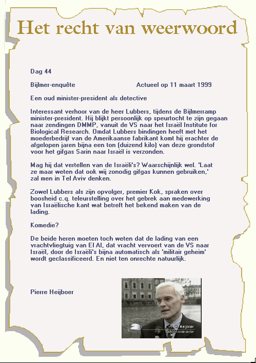 De mensen die voorlichting hebben gegeven, hebben getracht om correcte inlichtingen te geven, maar ook bij ons zijn er fouten gemaakt. Er was een soort chronisch wantrouwen tegen ons. De heer Kramer en de heer de Waard hebben alles gedaan om de zaken te regelen. Ik heb twintig brieven naar de kamer gestuurd en we hebben veel persbriefings gehouden. Door voortschrijdend inzicht worden zaken wel eens anders dan daarvoor. Op de brieven die ik verstuurde heb ik nauwelijks commentaar gehad, alleen de persbriefing lokte veel kritiek uit. Maar we hebben ons best gedaan. Op 4 oktober hebben de heren Weck en Wolleswinkel leiding gegeven. De heer Weck was secretaris-generaal en de heer Wolleswinkel was vooronderzoeker en hij leidde een team uit Nederland, uit Israël en de VS. Maar op het ministerie was dat de heer Weck.