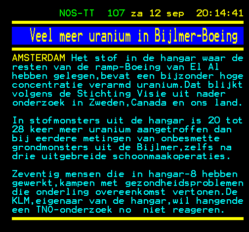 Het uranium komt een jaar later op papier en nu weten we dat er onderzoeken zijn gedaan en de risico's gering zijn. De uitkomsten werden gepubliceerd. We weten al vijf jaar dat dat zo is, maar we zijn niet in staat geweest om voorlichting te geven die de helderheid naar de burgerij geeft. Dat moet gepubliceerd worden anders blijf je met het probleem zitten. Ik zet een kanttekening: er is een tekort geweest aan informatieverschaffing en dat is waargenomen door de mensen die die informatie nodig hadden en dan ben ik terug bij het beging van het betoog. Er zit iets merkwaardigs in dat ik in alle objectiviteit vast kan stellen dat de burgemeester van Amsterdam als minister van Binnenlandse Zaken de zaak weer op zijn bord kreeg. De vlam in nu pas in de pan geslagen, maar de heer van Thijn heeft kennelijk niets gevonden aan dossiers. Hij werd nog extra belast bij het bewustzijn dat er zo veel mensen waren omgekomen. Als er klachten komen over de gezondheid en we kunnen niet het goede antwoord geven, dan zitten we met een probleem, maar niet bij de inspanning van de mensen die zich hebben ingezet. Ik heb nooit reden gezien om de Bijlmerramp te evalueren. Mevrouw Dales overleed, en het is er niet meer van gekomen om de evaluatie van Binnenlandse Zaken op de agenda te zetten. Ik had de behoefte niet, net zomin als ik dat had toen van Thijn minister van Binnenlandse Zaken werd. Nee niet in die fase.