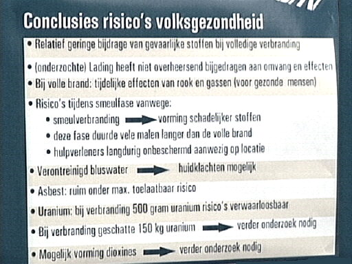 Ik ging er altijd van uit dat het om gevaarlijke lading ging. Het is nooit een overweging geweest om schadelijkheid van stoffen te betrekken bij de grote brand op zich ik ga er vanuit dat de brandweer en de GG&GD dat doen. Voor zover het gaat over gevaarlijks stoffen in de lading ben ik wel betrokken.