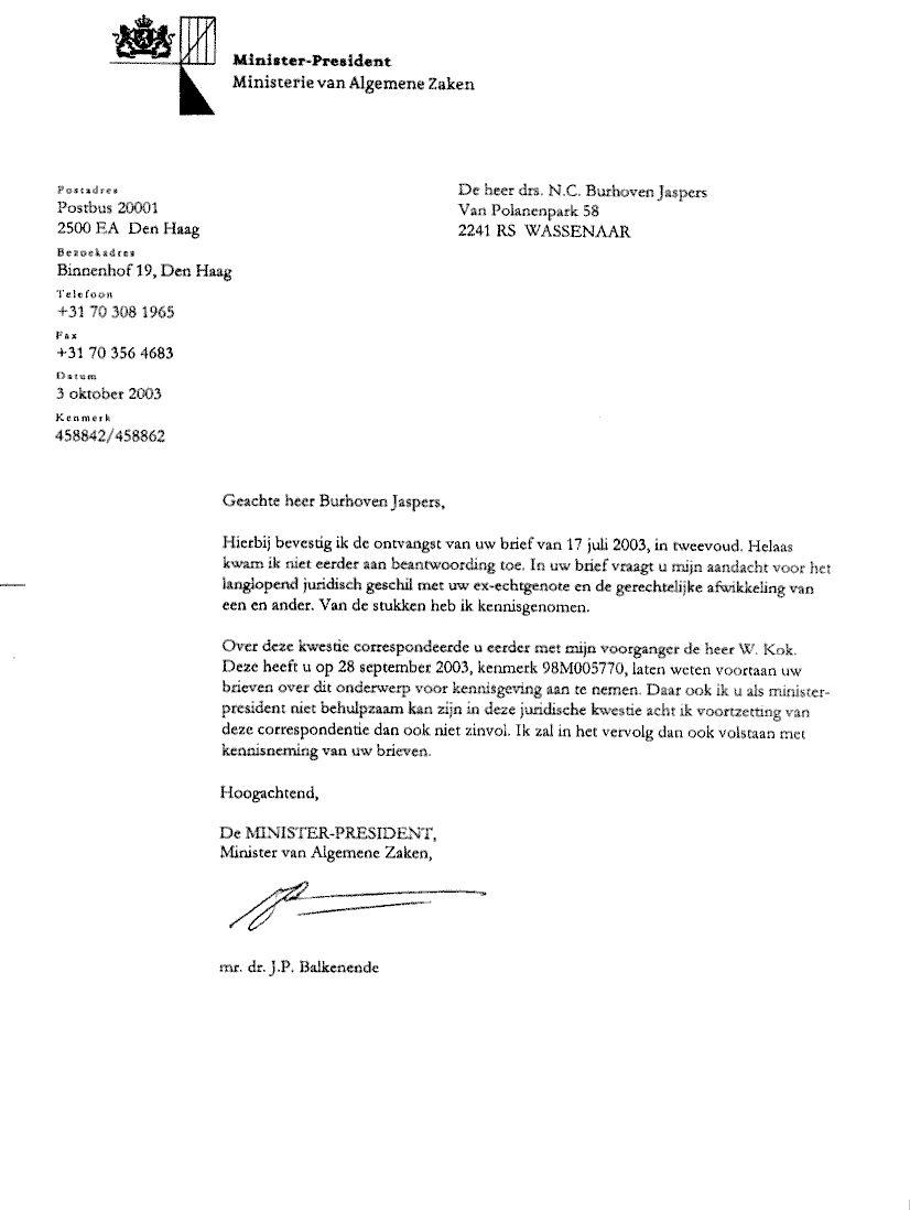Derde brief van drs. Burhoven Jaspers aan Minister-president Wim Kok