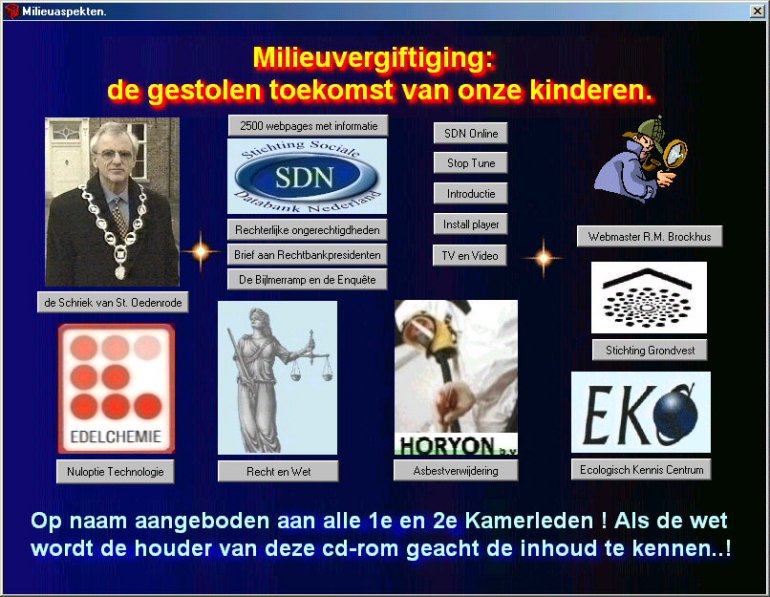 Wetteloosheid en onbetrouwbaarheid zijn in die gemeente dagelijkse praktijk. Bij de landelijke overheid, de rechtbanken, Hoge Raad en de Tweede Kamer ervaart hij tot nu toe niet anders rond deze dumppraktijken van zeer gevaarlijk chemisch afval. Men sluit heel bewust de ogen voor de gevaren van chemische genocide op de lange termijn, waarvan de eigen bevolking het slachtoffer zal zijn. Los daarvan voorziet ing. van Rooij economische problemen, omdat de schade die met een gedoogbeleid dat gebaseerd is op collusie en Pikmeer-arresten, die overheden en ambtenaren immuun maken voor strafvervolging, niet meer te betalen zal zijn door de generatie na ons. een prachtige rapportage van de Lokale Omroep LOSS over de propagande van het CDA tijdens de verkiezingen met de CDA-caravaan laat ziejn dat op politiek nivaue de messen al worden geslepen. Staatssecretaris van Geel van VROM en bugremeester P. Schriek verwijten over en weer dat de pot de ketel verwijt dat ie zwart ziet. |