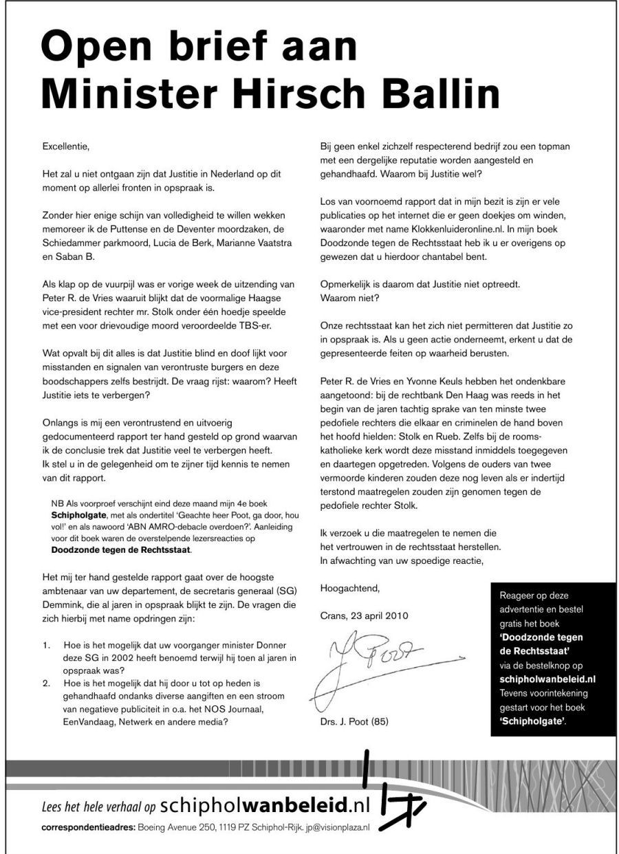 In hoeverre is deze CDA minister te vertrouwen als het gaat om zijn mededelingen over de verontrustende kastjes in Uw auto waarmee kan worden nagegaan waar U geweest bent en hoe snel U hebt gereden. Wat zijn de ontkenningen en beweringen van hem waard?. Wij lazen met belangstelling wat de heer Poot daarover in zijn boek "Doodzonde tegen de rechtstaat", allemaal zegt. Ook wat andere bekende advocaten over de ervaringen van de heer Poot zeggen. Het verontrustende daarvan is dat hetgeen Chipshol in onze “quasi rechtsstaat meemaakt helaas niet op zichzelf staat. Er is dus veel meer aan de hand en met het door Minister Eurlings en D’66 gepropageerde kastje waarschijnlijk ook. Eurlings en Pechthold zijn beiden voorstander van een “veel te machtige EU. Wij lazen, ook voor U: pag 232 e.v. Nieuwe bezems vegen goed en de heer Eurlings liet de commissie Vriesman het z.g. Crol- rapport maken over het reilen en zeilen van het staatsbedrijf Schiphol, echter kennelijk met de opdracht niets te vermelden over het Groenenbergterrein. Desondanks stonden de bevindingen van de commissie de heer Eurlings niet aan en ook de opvolger van de heer Cerfontaine, de heer Nijhuis bleek er niet van gecharmeerd. De presentatie van het rapport door de commissie Vriesman op 29 Januari 2009 maakte hij niet mee. Eurlings toonde zich een slecht verliezer en was zo woedend dat hij het waardevolle rapport in de prullenbak wierp hetgeen er op wijst dat deze jonge minister niet uit het goede Limburgse eikenhout is gesneden. Hij wil blijkbaar het conflict van Schiphol met Chipshol niet oplossen maar zelfs versterken om Chipshol uit te schakelen. Dat blijkt immers uit het tweede harde feit, de reservering van de overbodige tweede Kaagbaan , nota bene tot na 2020, terwijl dit uitstel al sinds 2003 twee keer is verlengd met drie jaar. (nu met 12 jaar, dus in totaal al bijna 20 jaar. Een tweede Kolderbaan na de mislukte Polderbaan. Het was boos opzet van Eurlings (hoeveel keren hebben wij na de Bijlmerramp al moeten spreken van boos opzet van Verkeer & Waterstaat? red) Van de economische gevolgen, een stilstand van de verdere ontwikkeling van Schiphol-Rijk, van de vertraging van de ontwikkeling der noodzakelijke werkgelegenheid trekt deze minister zich niets aan. Evenmin heeft hij kennelijk geen boodschap aan Rijsenhout met haar bewoners en beleggers. Dat vind ik een tweede bewijs van boos opzet, minachting voor de omwonenden van Schiphol en een gebrek aan sociaal gevoel., aldus de door de door zeer velen hoog geachte Heer Poot. Wij schreven het al eerder de jonge heer Eurlings is een doodgewone snotneuzerige praatjesmaker waarmee zijn partij geen eer inlegt. De volgende keer hopen wij het te hebben over een andere CDA minister die volgens de heer Poot en ons voor een parlementaire commissie over Schiphol behoort te verschijnen. Wat moet er volgens U gebeuren om onze rechtsstaat en onze veiligheid weer enigszins te herstellen? De commissie Vriesman maakte een opmerking over de activiteiten van de luchthaven op gebieden die vreemd aan de luchtvaart zijn "handel in grond".Op 23 Januari 2008 sprak Eurlings met de Tweede Kamer over het Groenenbergterrein dat aanleiding was geweest voor spanningen tussen de Luchthaven Schiphol en Chipshol. Aan het eind van het debat zei de heer Eurlings, dat hij een onafhankelijke commissie zou laten adviseren over de relatie tussn luchthavens en de ruimtelijke en economische ontwikkeling in bredere zin en toekomstgericht. de Cie Vriesman werd op 13.6.08 ingesteld maar op 29 Januari 2009 kwamen de heren Nijhuis en Eurlings bij de presentatie van het rapport nietopdagen omdat zij de inhoud al wisten en de adviezen van de commissie hun niet aanstonden. Waarom? De cie was door Eurlings gevraagd niet te spreken over het Groenenbergterrein waarmee hij een snelle oplossing van het conflict verhinderde. De cie was blijkbaar voor Eurlings te onafhankelijk want zij zette ondanks dit verbod wel vraagtekens bij de positie en het handelen van de luchthaven. Dit is uiteraard een erkenning van hetgeen Chipshol altijd over de tegenwerking heeft gezegd.. Verder spreekt het rapport van de cie over de vele rollen van Schiphol die bijdragen aan fricties met de grootste particuliere grondeigenaar rond Schiphol hetgeen volgens de cie de gebiedsontwikkeling belemmert. De cie acht het een risico, dat tengevolge van de verschillende doelen de mainport doelstelling onvoldoende tot haar recht komt. Ook dreigt het gevaar dat de particuliere ontwikkelaars zich bedreigd gaan voelen hetgeen niet bevorderlijk is voor het onderling vertrouwen in de regio. De risico’s worden verder vergroot omdat de inkomsten van de luchthaven steeds meer komen uit niet luchthaven gebonden bedrijvigheden. In 2007 was nog maar 23% van het exploitatie resultaat afkomstig van de luchtvaart en 77% aan niet –luchtvaartbedrijvigheden waarvan nota bene 41% van Real Estate. In verband met de omstandigheid, dat de luchthaven Schiphol zich is gaan gedragen als een handelaar en speculant in grond is dat ten koste gegaan van haar aandacht voor haar positie als mainport in Europa. Schiphol is langzamerhand gaan afzakken naar een minder belangrijke luchthaven. Dubai heeft het anders gedaan. Door Chipshol niet zo dwars te zitten heeft men niet kunnen profiteren van haar grote ervaring en indrukwekkende kennis met gebiedsontwikkeling en sociale werkwijze waarbij de gemaakte winst ten goede aan het ontwikkelde gebied kwamen. Een rechtbank in een land dat ingewerkte rechters laat vervangen vlak voor een uitspraak om een staatsbedrijf geen schadevergoeding te laten betalen en bovendien een oneerlijke president van de rechtbank te Haarlem beloont met een bevordering naar de rechtbank in den Haag is fout bezig. Ook minister Eurlings die het bouwverbod op het Groenenbergterrein op liet heffen door de Provincie opdat Schiphol minder schadevergoeding zou behoeven te betalen en dan de reservering voor de 2de Kaagbaan verlengd zodat het Groenenbergterrein toch niet beb