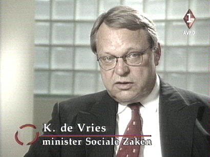 De PvdA-minister vindt het verder nergens voor nodig dat bejaarden gaan meebetalen aan de AOW. Dat werd deze week voorgesteld door de Wetenschappelijke Raad voor het Regeringsbeleid, die zich zorgen maakt over het groeiende aantal ouderen in de komende twintig jaar. "We hebben een AOW-fonds waar elk jaar vijf miljard gulden naar toe gaat. Over twintig jaar is dat honderd miljard gulden. Daar moeten we een belangrijk deel van die problemen mee kunnen oplossen", denkt De Vries.
