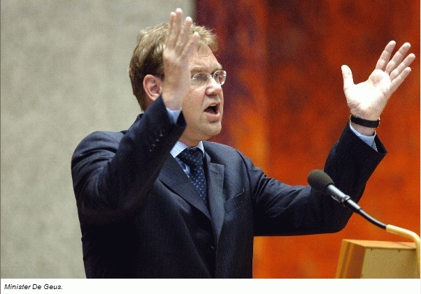 Bent u ook zo in deze functie gerold? Bezuinigd Want dat het ministerie van SZW geen gemakkelijke werkplek zou worden, werd al snel duidelijk. Er staan de komende jaren ingrijpende wijzigingen in de sociale zekerheid op stapel en daar is niet altijd begrip voor. Ook instellingen die de overheid werk uit handen nemen en het welzijn van de burger bevorderen, worden door de overheid gekort. De Geus geeft zelf de voorbeelden van de CNV-Jongeren en de Christelijke Gereformeerde jongerenvereniging. 'Ik ken ze beide van binnen. Ik vind dat dit soort organisaties in principe niet uit de hand van de overheid moet willen eten.' Voor de publieke omroepen, ook gesubsidieerde organisaties, ligt dat wat betreft De Geus anders. 'De publieke omroep is een domein waarin de overheid een eigen taak heeft. Ze wil daar juist niet het vrije spel der krachten van de commercie losmaken. Dat krachtenspel is in de media veel sterker dan bij kerkelijke organisaties.' De overheid maakt volgens De Geus vanaf nu een belangrijk onderscheid tussen instellingssubsidies en projectsubsidies. Sommige instellingen ontvangen in de toekomst geen subsidie meer, puur en alleen om hun organisatie te laten voortbestaan, maar wel voor goede projecten die zij willen opzetten. Zij kunnen een projectplan indienen en dan financiert de overheid dát specifieke project. Daar profiteert een stichting dan natuurlijk ook als instelling van. Ze kan echter minder gemakkelijk iemand op vaste basis aannemen.' De Geus schetst echter het ideale plaatje: 'De toekomst voor zo'n instelling wordt onzekerder, maar de uitdaging om goede projecten in te dienen, wordt groter.' De Nederlander moet van het kabinet Balkenende II meer verantwoordelijkheid gaan nemen. Nu alvast bezuinigt het kabinet op instellingen die dat gebrek aan verantwoordelijkheidsgevoel opvangen en diensten aanbieden die buren eigenlijk net zo goed hadden kunnen verrichten. De Geus ziet dat echter niet als onverantwoordelijk of voorbarig gedrag van de overheid. 'Er gebeurt in Nederland al enorm veel op het gebied van vrijwilligerszorg en mantelzorg. Allemaal ongesubsidieerd. En als het gaat om de golfclub, waarvoor de subsidie wegvalt: Mensen moeten voor iets dergelijks zelf maar iets over hebben. De overheid wil dat de burgers de verenigingen en stichtingen die ze belangrijk vinden zelf in stand houden. Dat doet de overheid niet. Een jongerenorganisatie zal dus door leden in stand gehouden moeten worden. Wie zijn wij als overheid om dat te faciliteren? Overigens zijn er wel organisaties met beperkt draagvlak die de overheid toch blijft ondersteunen.' Mag je dus concluderen dat de overheid haar handen aftrekt van die organisaties die wat haar betreft niet koste wat het kost moeten voortbestaan? De Geus: 'Zo is het. De overheid gaat minder bepalen wat belangrijke organisaties zijn. De stichting Wilde Ganzen krijgt geen subsidie. Vindt de overheid het niet belangrijk dat zij blijven bestaan? Ik sta sympathiek ten opzichte van deze organisatie, maar ik vind het geen overheidstaak om Wilde Ganzen te steunen. De laatste decennia is de welzijnssector steeds meer gaan leunen op de overheid. De inspanningen van sommige organisaties richtten zich vaak op de subsidie in plaats van op het oorspronkelijke doel.'