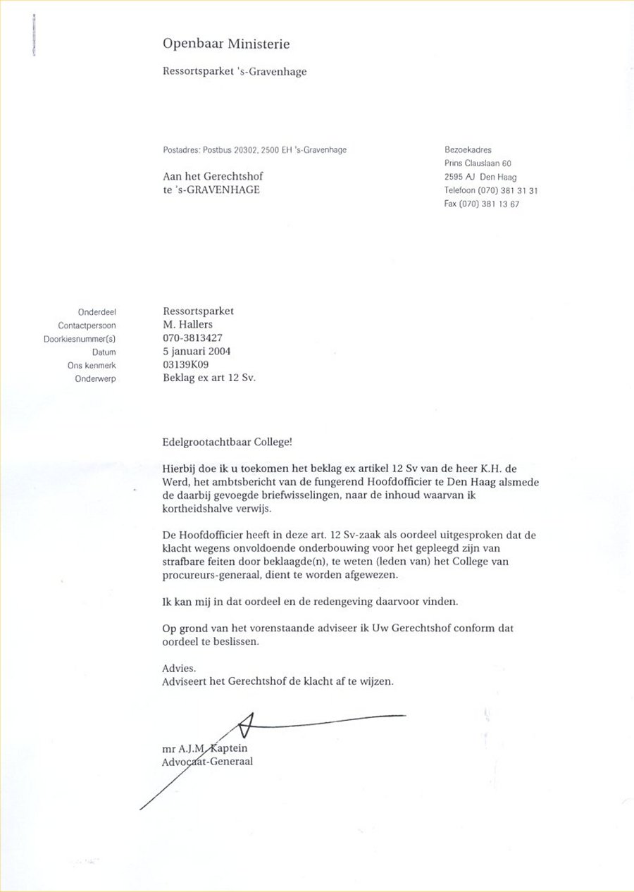 Voorts vraag ik er akte van dat Donner in zijn brief d.d. 23 juli 2003, op blz. 3 bovenaan, formeel heeft erkend dat het OM nota bene als wetshandhaver ex. art. 4 Ro en ondanks art. 29, 11 lid c juncto 12 Ro, en 207 lid 1 en 2 Sr, formeel de stelling heeft betrokken, dat het veelvuldig plegen van meineed ten laste van mijn persoonlijke juridische belangen en een behoorlijke procesgang niet strafrechterlijk diende te worden vervolgd. En zelfs dat daartoe zes dwingende uitspraken van Rechtbank, Gerechtshof en Hoge Raad der Nederlanden (waaronder drie bevelen ex. art. 12i Sv gegeven) niet werden opgevolgd en onwettig ter verjaring werden opgelegd.