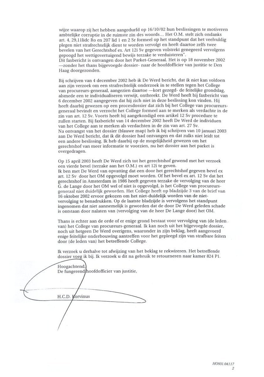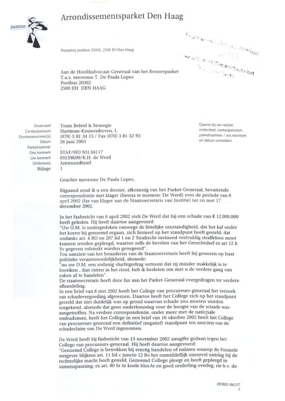 Voorts heb ik volstrekt duidelijk gemaakt dat ik niet zal toestaan dat wordt afgeweken van het formele standpunt dat het College van Procureurs-generaal en/of de Minister hebben ingenomen, zoals definitief is vastgelegd in hun gezamenlijke arglistige, bedrieglijke en juridisch volstrekt onvolwaardige brieven d.d. 16/10/02 en 02/04/03.