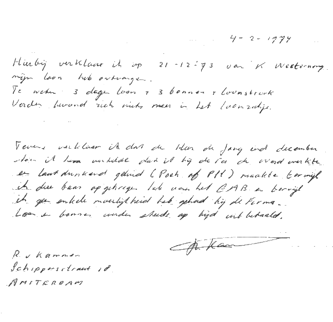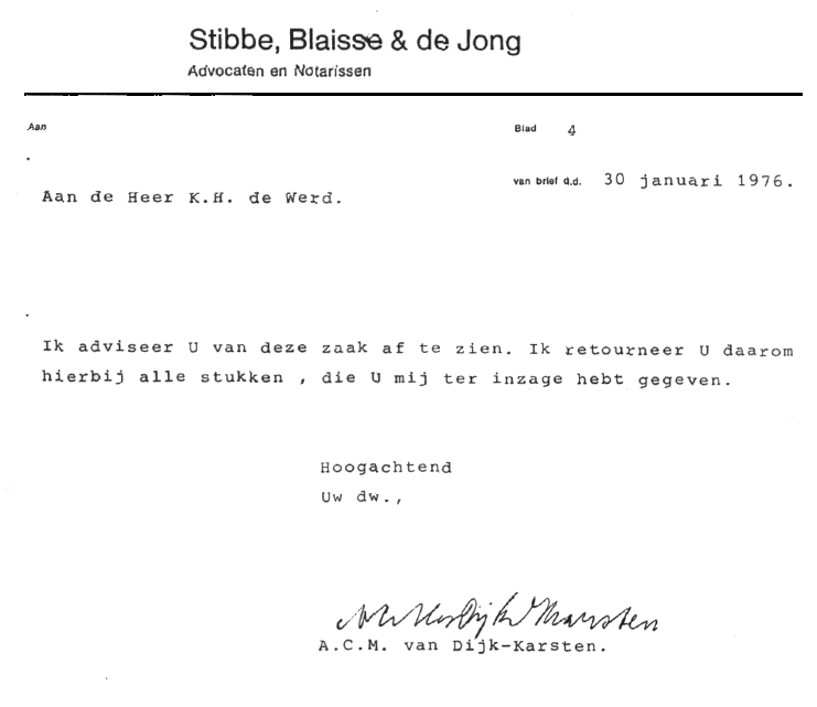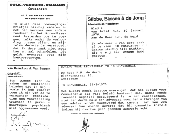 De Griffier Mr. L. van der Hoek: "gelukkig heb ik niet op die zaak gezeten, maar ik ken Elly van Schaardenburg al 22 jaar, zij heeft met mij over uw zaak gesproken, wat die bonden met u hebben uitgehaald, dat is meer dan verschrikkelijk, dat meen ik echt, zij heeft geen smeergelden aangenomen, daar steek ik mijn beide handen voor in het vuur, maar als u zegt, dat ook zij als rechter rekening diende te houden met die kolossale macht, die die rotbonden binnen onze samenleving nu eenmaal hebben, dan zit u dicht bij de waarheid, zeer dicht zelfs. Ik denk ook wel dat meineed werd gepleegd, in uw zaak zal nooit recht meer kunnen worden gesproken, dat is in en in triest. Denk toch aan uw gezinnetje. u bent nog zo jong, ik kan mij niet voorstellen, dat u met uw gezin hier niet aan onderdoor gaat, laat het recht toch voor wat het is, echt ik meen het!"