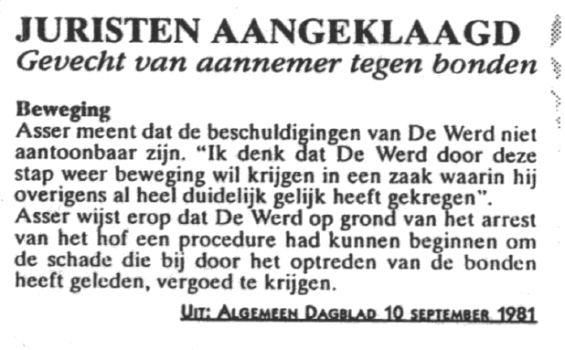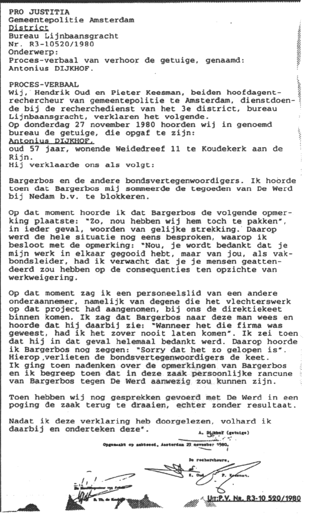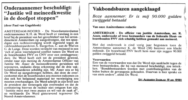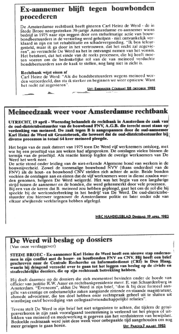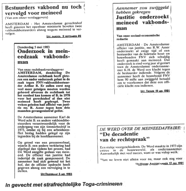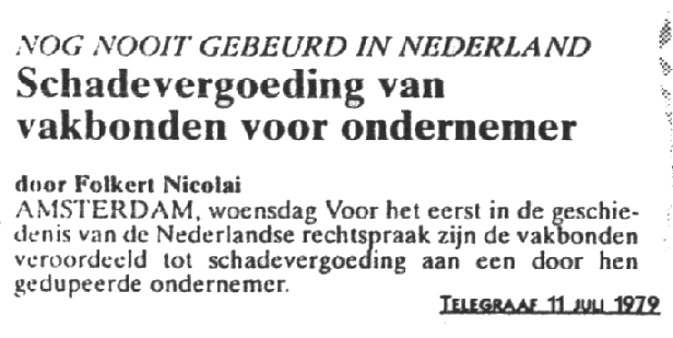 Als hij aangifte doet ter zake meineed, waardoor de vakbondscriminelen het risico ontstaat, dat zij in de gevangenis komen, dreigen zij hem veelvuldig te zullen vermoorden. Hij laat zich echter niet intimideren en na een eindeloos juridisch gevecht tegen al "zijn eigen advocaten" en malafide togadragers bij de rechterlijke macht, worden op 20 juni 1979 door het Gerechtshof bij de arrondissement Amsterdam, de Bouwbonden FNV en CNV voor het eerst in de Nederlandse rechtsgeschiedenis veroordeeld tot schadeplicht; en wel door hun eigen togacriminelen.