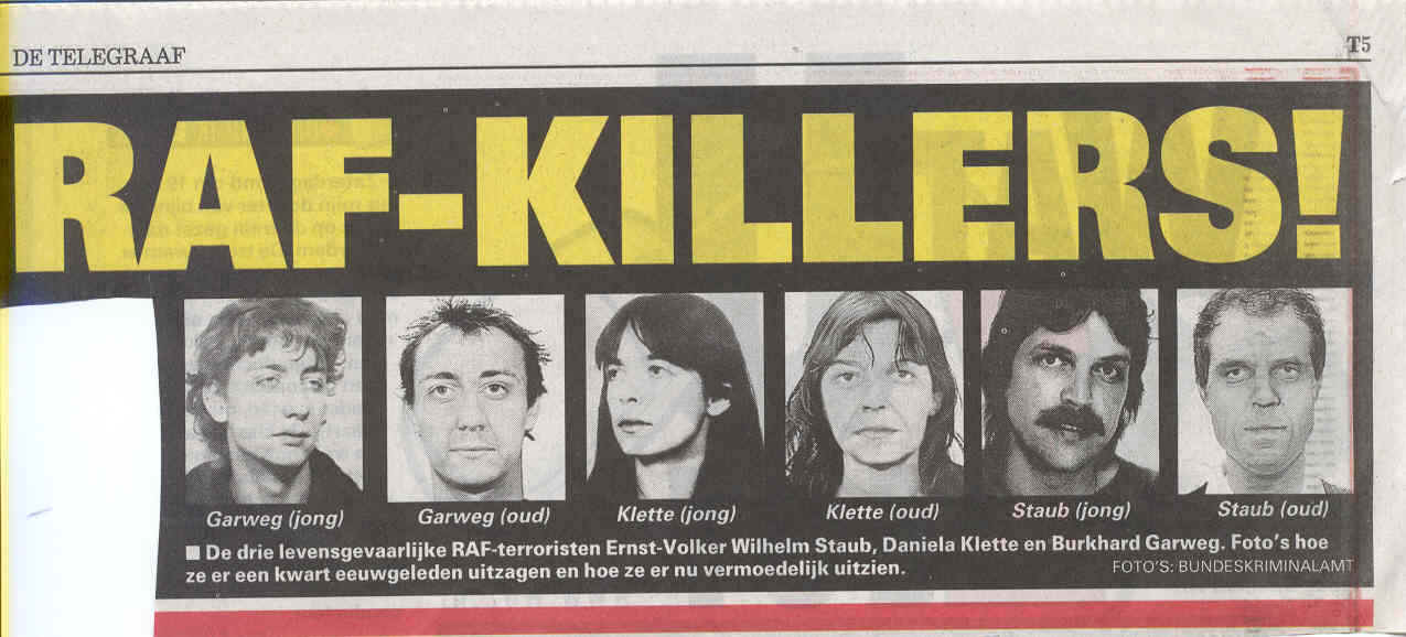 Volgens het dagblad de Telegraaf, dat een verschijningsverbod kreeg opgelegd van dertig jaar vanwege gevoerde Nazi Propaganda zijn zij gevaarlijk! Volgens de Revolutionairen zijn zij die ter bevrediging van primitieve lustgevoelens middels ernstig handelen en nalaten verantwoordelijk zijn voor de volstrekt falende juridisch/politieke controle op het deugdelijk functioneren van de democratische rechtsstaat vele malen gevaarlijker immers: Zij hebben onomwonden bewezen wat zij noemen terroristische organisaties als, de Rote Armee Fraktion bij gebrek aan beter, wel degelijk bestaansrecht heeft c.q. niet gemist kunnen worden immers: Wie anders roept de malafide leden bij de Zittende en Staande Magistratuur alsmede Advocatuur en Politici die via hun intellectueel arglistig bedrog ten laste van een behoorlijke procesgang, c.q. de rechtszekerheid van de burgers, ontstellend veel onnodig leed veroorzaken ter verantwoording nu alle wettelijke controle daarop als gevolg van de zeer ernstige leemt´s in de Formele Wet daarin opzettelijk tot stand gebracht, ter handhaving van een klasse justitie samenleving, volstrekt blijkt te falen? Tot zoverre de politieke tak van de Revolutionairen. Het uitvoerend Orgaan - lees het Verzet - blijft strikt geheim gelet op de ernst en de aard van haar werkzaamheden, die er bij gebrek aan beter op zijn gericht de Zittende en Staande Magistratuur, Advocatuur en de politiek, ten behoeve van Rechtsherstel van Criminele Elementen op alternatieve wijze te zuiveren. Onder Criminele Elementen wordt verstaan: Topjuristen die blijkens objectieve normen van de Hoge Raad der Nederlanden ter aanranding van een behoorlijke procesgang c.q. Vrouwe Justitia ambtshalve functioneren en motiveren op arglistig, bedrieglijk en juridisch volstrekt onvolwaardig niveau, waarvan akte! Voorts: Politici die ondanks hun ambtseden middels ernstig handelen en nalaten ten laste van de rechtszekerheid van de burgers tot ver in de volgende generatie´s genoemde topjuristen hun ambtsmisdrijven ongestoord laten plegen, via collusie met de huidige door en door corrupte gevestigde Orde, waarmee zij het algemeen belang c.q. het welzijn van de burgers en hun rechtszekerheid veelvuldig hebben opgeofferd aan strikt persoonlijk en/of uitermate dubieus partij / politiek belang, waarvan eveneens akte! Het voorgaande wordt door de Revolutionairen en haar uitvoerende Organen opgevat als een aanval op het Democratisch rechtssysteem voorzover nog aanwezig door de huidige corrupte gevestigde Orde! ten laste van de rechtszekerheid van allen op Nederlands grondgebied, tot ver in de volgende Generatie´s waarop door het Verzet, passend zal worden gereageerd! In de affaire Cees B die via opzettelijk uitgesproken gerechtelijke dwaling werd veroordeeld tot l8 jaar gevangenisstraf en TBS daarbij daadwerkelijk vier jaar lang van zijn individuele vrijheid werd berooft, betekent dit dat de Minister van Justitie Mr. Piet Hein Donner onmiddellijk uit zijn functie dient te worden ontheven en alle betrokken leden bij Zittende en Staande Magistratuur die als topjuristen terzake in strijd met de objectieve normen van de Hoge Raad der Nederlanden ambtshalve hebben gefunctioneerd en gemotiveerd op arglistig, bedrieglijk en juridisch onvolwaardig niveau dienen te worden ontslagen en berecht inclusief alle medewerkers die van voorgaande onrechtmatige vrijheidsberoving op de hoogte waren en daarover hebben gezwegen, zodoende zich via ernstig nalaten hebben bezondigt aan onrechtmatige vrijheidsberoving, waarvan akte!