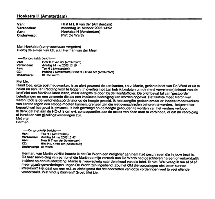 De getuigen van de Werd op de publieke tribune in de zittingzaal op 17 augustus 2004. Zij allen hebben persoonlijk waargenomen dat Kantonrechter Mei Lie Tan volstrekt anoniem wenste te blijven, zij De Werd als gedaagde begon te Wraken, en volstrekt negeerde dat zijzelf formeel werd gewraakt. Voorts dat die wraking formeel werd genotuleerd door Griffier M.L.K. van der Hilst; en vervolgens deze door hem werd verduisterd, met als doel onrechtmatige vrijheidsberoving te bewerkstelligen via misbruik van de gewapende macht, gebaseerd op valsheid in geschrifte. De officier van Justitie Parket Leeuwarden hield na de zitting nog een aparte zitting met de aanwezigen op de publieke tribune achter gesloten deuren en wist voor de aanvang van de zitting hen al te vertellen, dat de procedures (ook de strafrechtelijke procedures) tussen de Werd en het OM op zich eenvoudig van aard zijn. Echter, de Werd heeft de nare gewoonte om die van begin af aan onder zijn controle te houden. Verder wist hij hen op gespannen voet met de feitelijke waarheid te melden, dat er overvloedig politie aanwezig was. Dit, omdat de Werd tijdens eerdere zittingen nogal agressief over kwam en dat de Werd ter zake bij verstek zou worden veroordeeld. De gehele kantongerechtzitting d.d. 17 augustus 2004, werd op band opgenomen, inclusief wat kort daarvoor en na er in strijd met de formele wet gebeurde. Wat dat betreft geldt het gezegde, al is de leugen nog zo snel, de techniek die achterhaald hem wel.Vervolgens maakte griffier M.L.K. van der Hilst een valse authentieke akte op door een kruisje te plaatsen op het voorgedrukte pamflet *Machtiging tot Gijzeling toegewezen*, waarbij hij zeven dagen toegestaan invulde, die vervolgens anoniem werd ondertekend door 'Kantonrechter' Mei Lie Tan, dit ondanks dat zij formeel was gewraakt en mij kenbaar had gemaakt dat zij daarin binnen veertien dagen schriftelijk uitspraak zou doen. Tot slot deed griffier M.L.K. van der Hilst op verzoek van de Voorzitter van de Rechtbank Amsterdam Sector Kanton H.Th van der Meer valse aangifte tegen de Werd terzake bedreiging, waarvan akte! 5 ) H.Th van der Meer : Voorzitter van de Rechtbank Sector Kanton: Verduisterde in samenspanning met een medewerker van de postkamer, te weten Ruud Cee, een brief die niet voor hem was bestemt doch voor Griffier M.L.K. van der Hilst en deed vervolgens valse aangifte met genoemde griffier, waarbij hij aan Leo de Wit als defecte schakel in de verticale controle op Justitie / rechtspleging liet weten dat: De brief van de Werd aan griffier M.L.K. van der Hilst als zijnde bedreigend kan worden opgevat en als zodanig dient te worden gelezen. Hij verlangde vervolgens van de Wit Strafrechtelijke vervolging omdat bepaalde normen niet straffeloos mochten worden overschreden en wenst daarvan op de hoogte te worden gesteld.6 ) Leo de Wit, kennelijk niet verheugd over mijn publicaties, over zijn ambtshalve decadent functioneren als defecte schakeling in de verticale controle op Justitie / rechtspleging had daar ter bevrediging van zijn primitieve lustgevoelens - lees via ernstig handelen en nalaten anders dan uit hoofde van ziekte of gebreken, als bedoeld in art. 11 lidc juncto 12 Ro c.q. misbruik van zijn ambtelijke bevoegdheden in overtreffende trap - wel oren naar evident waaraan hij op verzoek van de Togacrimineel H.Th. van der Meer, over ging tot onrechtmatige vrijheidsberoving, via ernstig misbruik van zijn ambtelijke bevoegdheden, waarvan akte! Mij vervolgens confronteerde met de Verboden Zaanse Methode met als doel op onwettige wijze bekentenissen af te dwingen die zouden moeten stroken met de inhoudelijke strekking van de door H. Hoekstra uitgebrachte ondeugdelijke dagvaarding, met het zelfde doel confronteerde met de corrupte brigadier van Politie J.F. Grinhuis die daartoe in zijn ambtsedig - Proces-Verbaal van Verhoor bijzonder creatief te werk ging onder het motto barbertje moet hangen. Uiteindelijk kennelijk zwaar teleur gesteld, dat dit alles als gevolg van mijn juridische kennis en ervaringen met ambtelijke corruptie bij Justitie / rechtspleging vruchteloos bleek te zijn, doen opsluiten in een daartoe niet bestemde naar urine stinkende wachtcel acht uren lang met een bewegingsvrijheid van nog geen vierkante meter, ter psychische mishandeling, waarvan akte!Geachte medeburgers, U ziet gelet op het voorgaande, dat de benadeelde van ambtelijke corruptie terecht komt in een ongekende juridische holocaust, indien hij de ambtelijke corruptie waarmede hij / zij wordt geconfronteerd niet wenst te accepteren. De oorzaak ligt in het feit, dat de betrokken togacriminelen zich vanwege het ontstellend gebrek aan journalistiek / politieke controle op hun ambtshalve decadent functioneren en gelet op hun maatschappelijke status onaantastbaar wanen. Vandaar ook, dat zij het gezegde ratten verlaten het zinkende schip niet kennen, integendeel in dat geval sluiten zich de rijen. Uiteraard demoniseren zij daarbij het door hen uitverkoren slachtoffer waar mogelijk een goed voorbeeld hiervan treft u aan in het E - mail verkeer van genoemde togacriminelen onderling, dat ik op 3 januari 2007 tijdens inzage ter Griffie in de Strafdossiers terzake aantrof. (Zie hieronder)