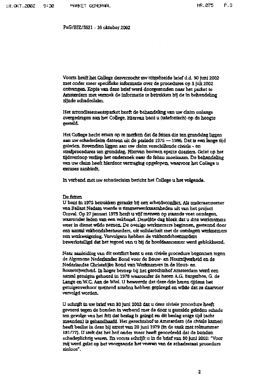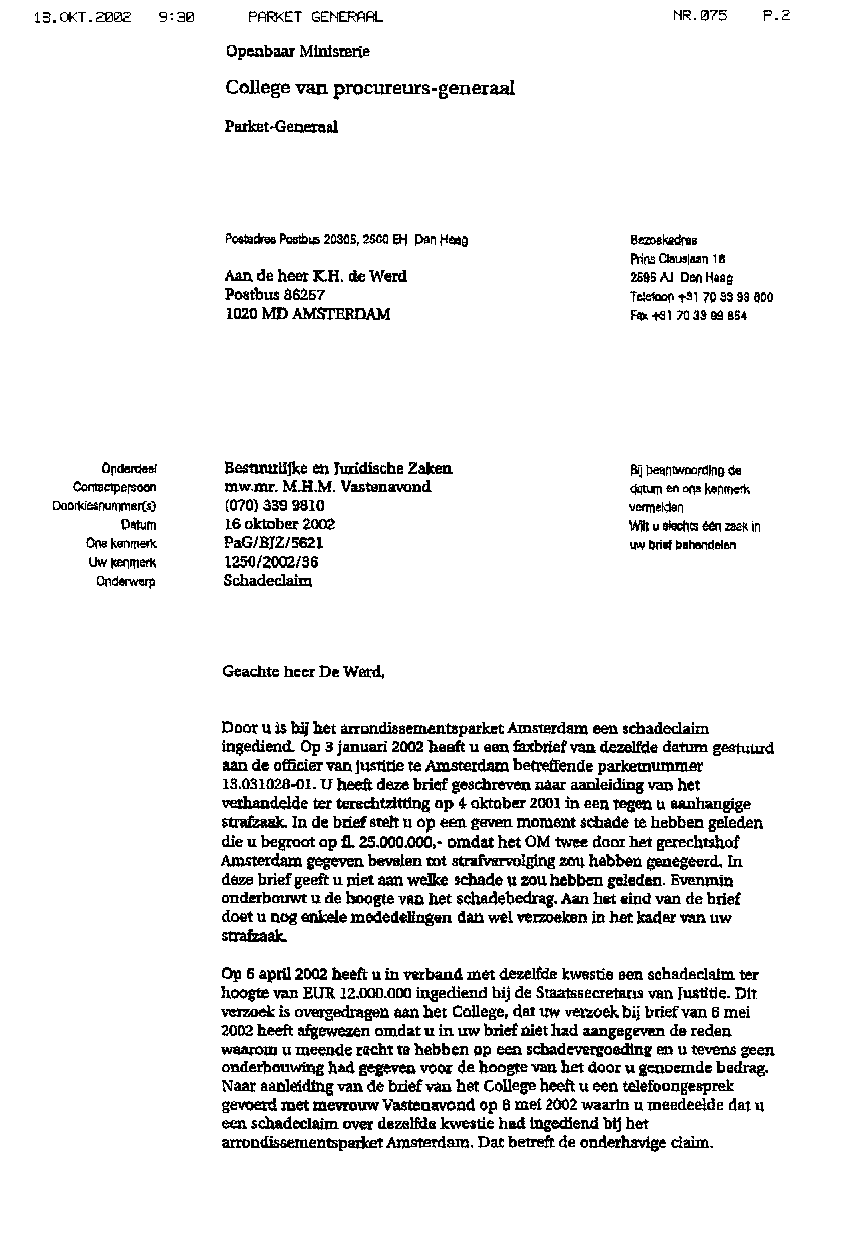 De Staatssecretaris van Justitie mevr. mr. Kalsbeek heeft mij kenbaar gemaakt dat zij mijn schadeclaim ter afhandeling heeft doorgezonden aan het College van Procureurs-generaal. Genoemd College heeft niets anders gedaan dan doordelegeren naar het bedrijfsbureau bestuurlijke juridische zaken, zonder mij daarvan in kennis te stellen.