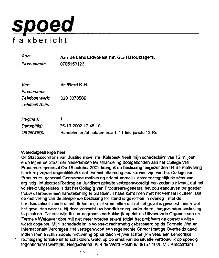 De Staatssecretaris van Justitie mevr. mr. Kalsbeek heeft mij kenbaar gemaakt dat zij mijn schadeclaim ter afhandeling heeft doorgezonden aan het College van Procureurs-generaal. Genoemd College heeft niets anders gedaan dan doordelegeren naar het bedrijfsbureau bestuurlijke juridische zaken, zonder mij daarvan in kennis te stellen. Mevr. M.A. Vastenavond die daar de scepter zwaait heeft zich vervolgens bij mij ruim een halfjaar lang voorgedaan als zijnde de contact persoon tussen mij en het College. Dit in de wetenschap dat niet het College van Procureurs-generaal terzake maar zij zelf de beslissing zou nemen en motiveren in overleg met een zekere mr. van Gielen die bij haar op kantoor zit. Zij schakelde volgens haar zeggen daarbij de Hoofdofficier van Justitie de Wit in, wiens onmiddellijke reactie was dat de Werd onder geen voorwaarde enige informatie mocht worden verstrekt, behalve het onderzoek is gaande! Die toestand heeft men een half jaar in stand weten te houden en telkens komt men in de motivering met excuus voor de lange duur en verzint daar wat redenen bij. Welnu ik kan daarover duidelijk zijn. Dat excuus wordt mijnerzijds niet geaccepteerd. Ik ken op grond van mijne ruime ervaring met het OM de gang van zaken aldaar meer dan voldoende om te weten wat gaande is. Mr. Max Rood liet voorkort nog in de media weten: "als advocaat heb ik geleerd hoe effectief het kan zijn om een zaak slepende te houden". Rood verkreeg 48 keer uitstel in een procedure die normalerwijze vanwege zijn juridische eenvoud nog geen tien minuten zou mogen duren.