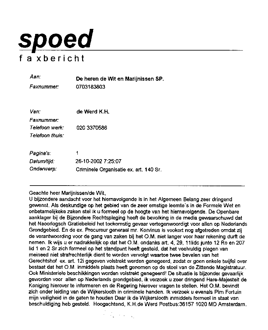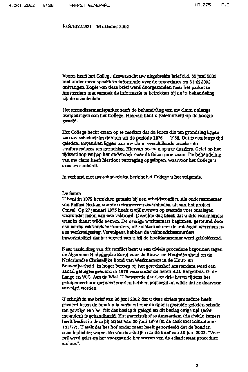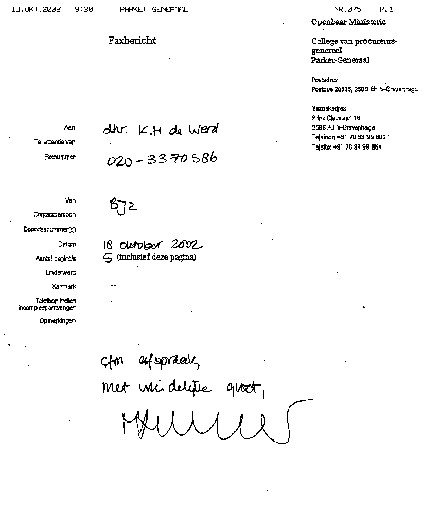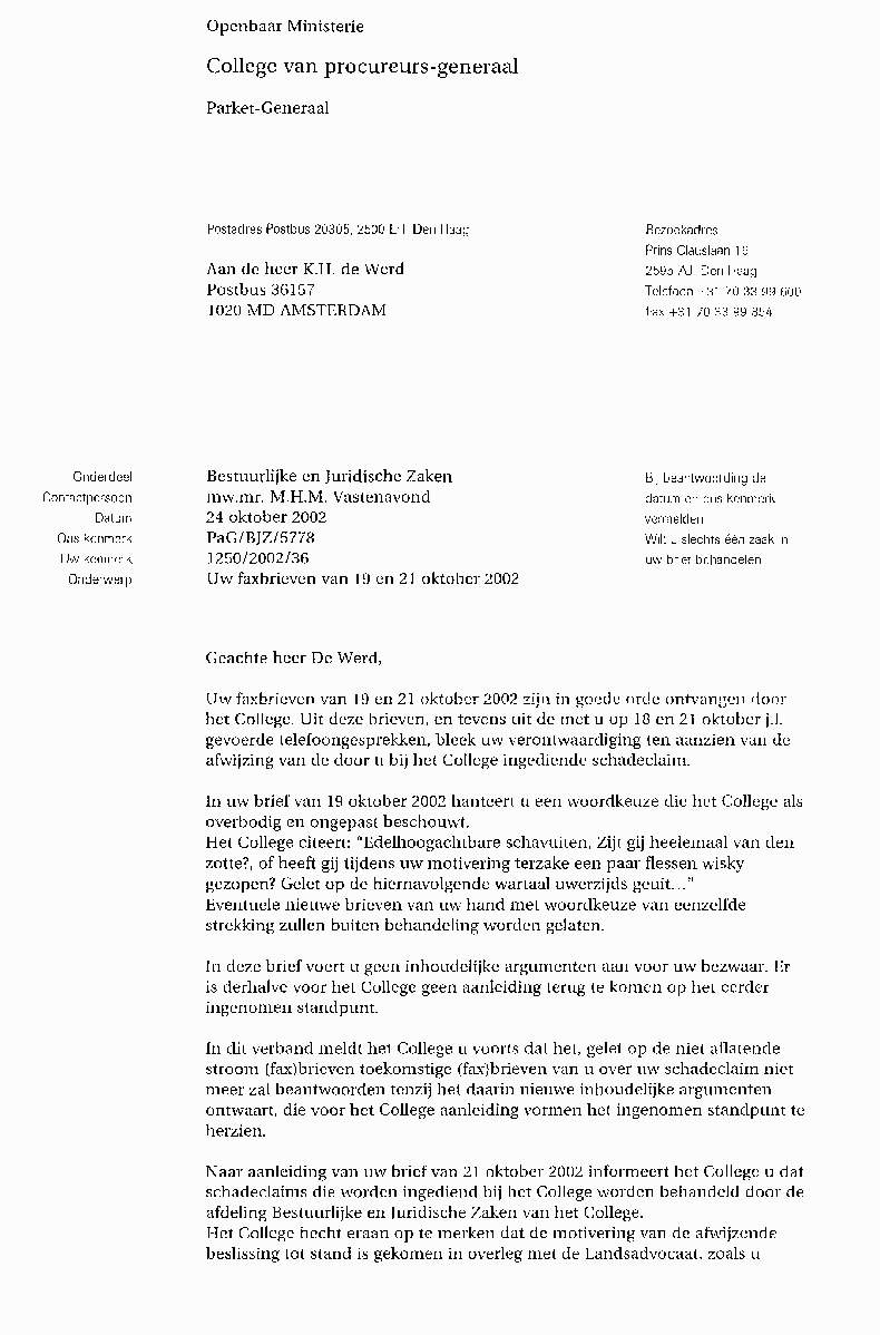 Hartelijk dank voor de toezending van de ontvangstbevestiging van mijn schrijven d.d. 18/10/02. Als bijlage treft u aan de beslissing van het College van Procureurs-generaal en de wijze waarop men het aandurfde die te motiveren. Uit de ondertekening blijkt dat er werd gedelegeerd tot het niveau van de heer D.J. de Jong. Eveneens blijkt links bovenaan dat mevr. mr. M.H.M. Vastenavond als contactpersoon terzake functioneert. Daar mag ik dus formeel van uitgaan. Mevr. Vastenavond met wie ik alle contacten heb gehad heeft mij een halfjaar lang in de waan gelaten dat het College van Procureurs-generaal terzake zou beslissen. Ik kon er van uitgaan dat het College op uiterst integere wijze en zorgvuldig wenste te motiveren; vandaar dat er een diepgaand onderzoek diende te worden verricht, wat veel tijd vergde. Als ik voldoende geduld zou tonen, dan zou ik een motivering van de beslissing krijgen. Zoals men dat op het niveau van Procureurs-generaal en te goeder trouw zou mogen verwachten. Wel nu, eindelijk maakte mevr. Vastenavond mij bekend, dat de beslissing naar mijn postbus was gestuurd. Daar zich enkele dagen later nog niets in mijn postbus bevond, heb ik daarover met haar gebeld. Zij deed verbaasd dat ik de beslissing nog niet in mijn postbus had ontvangen, immers volgens haar zeggen was die mij al enkele dagen eerder toegezonden.