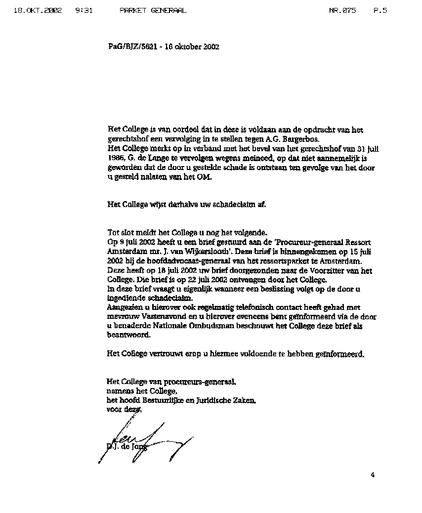 Welnu, meteen valt al op dat geen namen worden genoemd over welke officieren van Justitie men het heeft. Daarbij komt nog er was maar één betrokken officier en dat is mr. R.F. Asser. Die het tweede bevel heeft gekregen en dat bevel vervolgens onderdak in zijn prullenbak heeft verleend! Daarbij komt ook nog dat als een strafrechterlijke procedure zou zijn gevolgd tegen G. de Lange, dat ik dan evenals bij A.G. Bargerbos als getuige van de Officier van Justitie en/of de advocaat-generaal zou zijn opgetreden. En ik ben rechtstreeks belanghebbende die de gehele affaire van minuut tot minuut heeft meegemaakt. Ik ken hem als geen ander! Zou ik dan niet hebben geweten of G. de Lange werd vervolg? Reken maar!! Hij werd aantoonbaar niet vervolgd! Dat men in de archieven daarover niets terug vindt dat is toch volstrekt logisch! Als er ondanks het bevel van het Gerechtshof geen dagvaarding door de Officier van Justitie wordt uitgebracht, dan vindt er ook geen strafrechtelijke procedure plaats. Dus vindt men daarover niets terug in de archieven! Zo simpel is dat. In de motivering trekt men de conclusie dat er niets te vinden valt, waaruit blijkt dat de dagvaarding niet werd uitgebracht. Wat moet ik met zo'n kronkelredenering? Men stelle zich dat eens voor. Wat zou men dan in de archieven moeten aantreffen indien niet werd vervolgd? Precies, helemaal niets! Wat zou men aantreffen indien wel werd gedagvaard? Precies, in dat geval treft men in de archieven de procesdossiers wel aan. Dus we zijn het er nu eindelijk over eens G. de Lange nimmer werd gedagvaard en dit houd in dat er ondanks twee bevelen van het Gerechtshof er formeel nimmer een meineedprocedure heeft plaatsgevonden. Ik heb uit telefoongesprekken begrepen dat men nu zich er op tracht te beroepen dat de stukken uit het archief zijn verdwenen, ook dat zal weinig helpen. Immers, waarom vraagt men niet gewoon aan de meinedige verdachte G. de Lange zelf of hij ooit terzake meineed werd gedagvaard? Als antwoord daarop kreeg ik te horen: "Mr. R.W. Asser kan men dat niet vragen omdat hij geen Officier van Justitie meer is; hij is nu namelijk een gewoon burger!" Nationale Ombudsman wat moet ik met dit soort dubieuze antwoorden. Genoemde Officier van Justitie R.W. Asser woont in Amstelveen, Amstelhoven no. 3, postcode 1181 PA Amstelveen. Het had toch een kleine moeite geweest om die man even te bellen, of even langs te gaan? Immers Mr. R.W. Asser is de Officier van Justitie die het tweede bevel in zijn prullenbak liet verdwijnen. Die zou dat ook best kunnen vertellen. Misschien ga ik zelf wel even bij hem langs, want de verstandhouding tussen mij en genoemde officier is altijd prima gebleven. Ondanks alles was er altijd wederzijds respect. Dat geld ook voor Mr. van C.A.P.C. van Riel. Tot voorkort was ik nog bij hem op de koffie in Alkmaar. Hij begeleidde mij zijn Rechtbank uit met de mededeling: "Iedereen in dit gebouw weet dat ik bijzondere gasten begeleid tot aan de voordeur. En jij de Werd, bent voor mij een heel bijzondere gast". Zowel genoemde Officier als Advocaat-generaal weten beide net als de Werd wat dat zegt. Dan is het zo en de Werd zegt het nogmaals: G. de Lange werd nimmer gedagvaard; waarvan akte! Dat men blijkens de motivering tegen al het wettig overtuigend bewijs in doet voorkomen alsof de bevelen van het Gerechtshof niet middels ernstig handelen en/of nalaten werden genegeerd verbaast mij in het geheel niet. Immers niet voor niets is de Procureur-generaal mr. Korvinus afgetreden omdat zij de gang van zaken bij het OM niet meer voor haar verantwoording durfde te nemen. "U moet mijn aftreden dan ook zien als een signaal naar de samenleving, hoewel ik bang ben dat dit signaal niet zal worden gehoord", aldus genoemde magistrate in de media! Wat het tweede bevel van 31 juli 1986 betreft, daar komt men wel met een zeer kromme redenering. Ik citeer: "Het College merkt op i.v.m. het bevel van het Gerechtshof van 31juli 1986 G. de Lange te vervolgen wegens meineed, opdat niet aannemelijk is geworden dat de door u gestelde schade is ontstaan tengevolge van het door u gestelde nalaten van het O.M." Welnu ook hier spreekt de motivering met twee tongen, immers zowel mr. van Riel als Mr. Asser hebben in formele documenten er geen enkele twijfel over laten bestaan, dat mij als gevolg van de vele meinedige verklaringen ernstig onrecht werd aangedaan en ik benadeeld ben. Daarbij komt nog dat het OM wordt geacht met mij te weten, dat de kans op een behoorlijke rechtsgang vrijwel wordt uitgesloten indien op zo'n grote schaal meineed wordt gepleegd. De politiefunctionarissen Oud en Keesman verklaarden zelfs voor TROS Aktua-TV dat zij de affaire zeer diepgaand hebben onderzocht en dat hen daarbij is gebleken dat er zo openlijk en veelvuldig meineed werd gepleegd, dat daarover bij alle aanwezigen in de Rechtszaal geen enkele twijfel kon bestaan! Het gevolg van het voorgaande was inderdaad dat voor mij - in strijd met de Formele Wet en Internationale Verdragen - de gang naar de Rechter volledig werd afgesneden. De advocaat van de verdachte Bargerbos verklaarde in de rechtszaal: "Mijn cliënt heeft geen meineed gepleegd, doch onder ede met de waarheid gespeeld!" Overigens heeft de verdachte Bargerbos een volledige bekentenis afgelegd, zoals vastgelegd in een ambtsedig Proces-verbaal van de genoemde Politiefunctionarissen. Echter ook die werd door Rechtbank en Gerechtshof volstrekt genegeerd. Natuurlijk werd er niet voor niets veelvuldig meineed gepleegd. Ik heb het bijgehouden en ik kwam in totaal op 68 keer! Jawel u leest het goed 68 keer! De bedoeling daarvan is om een behoorlijke rechtspleging volledig uit te schakelen en dat is terzake voor de volle 100% gelukt! De schade zowel materieel als immaterieel is enorm. Mijn bouwbedrijf ging ter ziele omdat acht maanden lang een ondeugdelijk beslag werd gelegd; zelfs zonder van waardeverklaring, waardoor 48 vakbekwame timmerlieden hun baan verloren. Jarenlang werd ik met mijn gezin gegijzeld in langdurige 