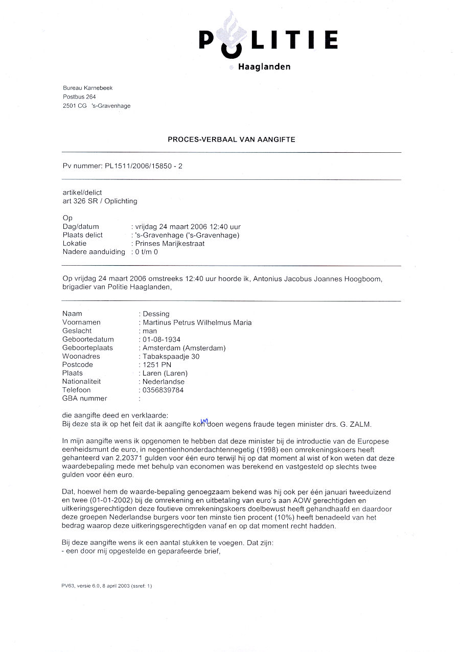 Aangifte bij de politie wegens fraude, gepleegd door de minister van Financiën G. Zalm