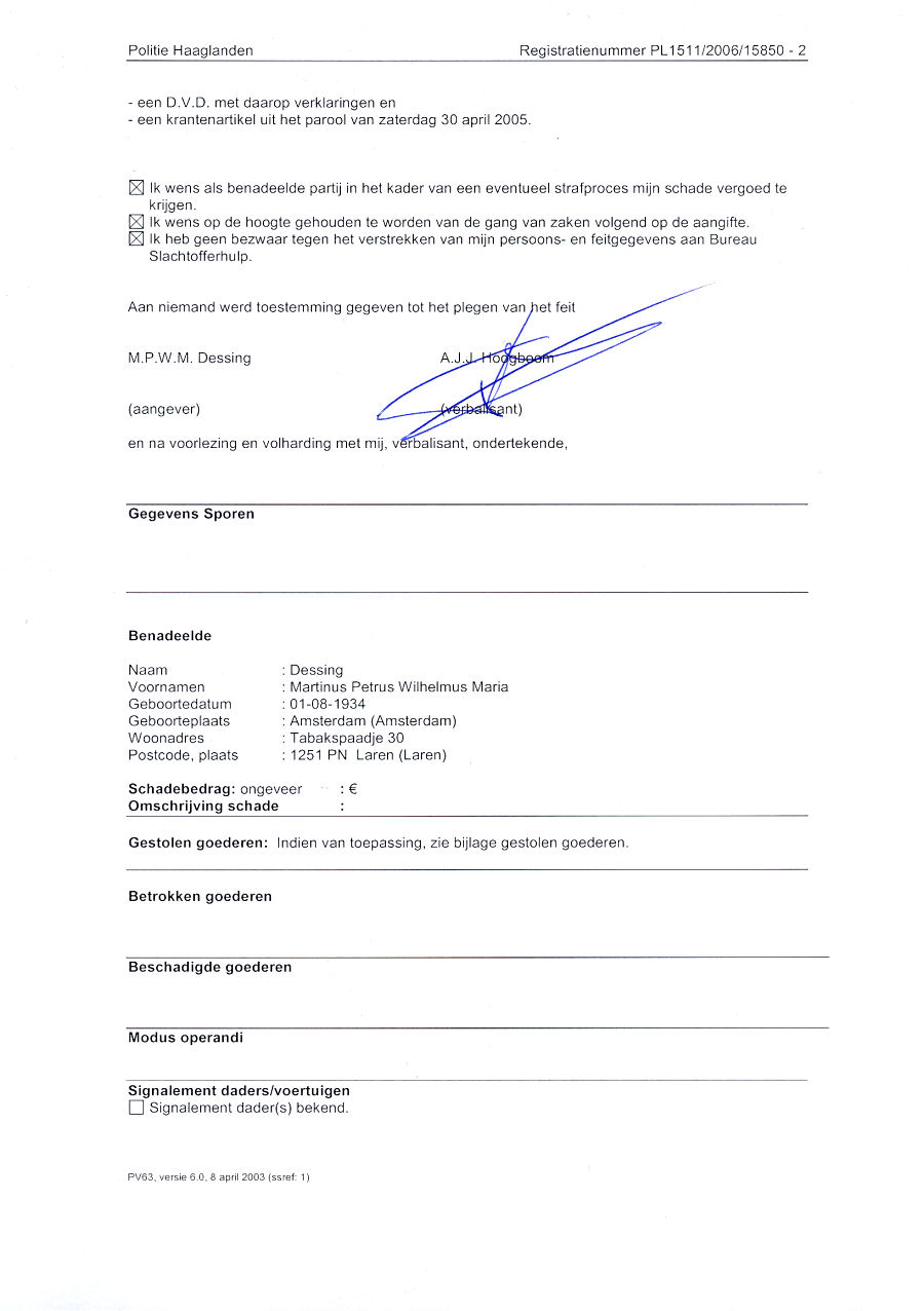 Politie Haaglanden Bureau Karnebeek Postbus 204 2501 CG 's-Gravenhage Fax: 070-4241724 (verzonden: 28-03-2006 om 11.08 uur) t.a.v. A.J.J. Hoogboom Hierbij stuur ik u, M.P.W.M. Dessing een aanvulling op de aangifte wegens oplichting d.d. 24 maart 2006 12.40 uur. Een essentieel onderdeel moet nog daar aan toegevoegd worden. Separaat stuur ik de getekende aanvulling aan uw adres: Bureau Karnebeek, postbus 204, 2501 CG 's-Gravenhage. Verder verwijs ik naar de website op internet waar de aangifte en de aanvulling openbaar zijn gemaakt. dessing-aangifte.htm