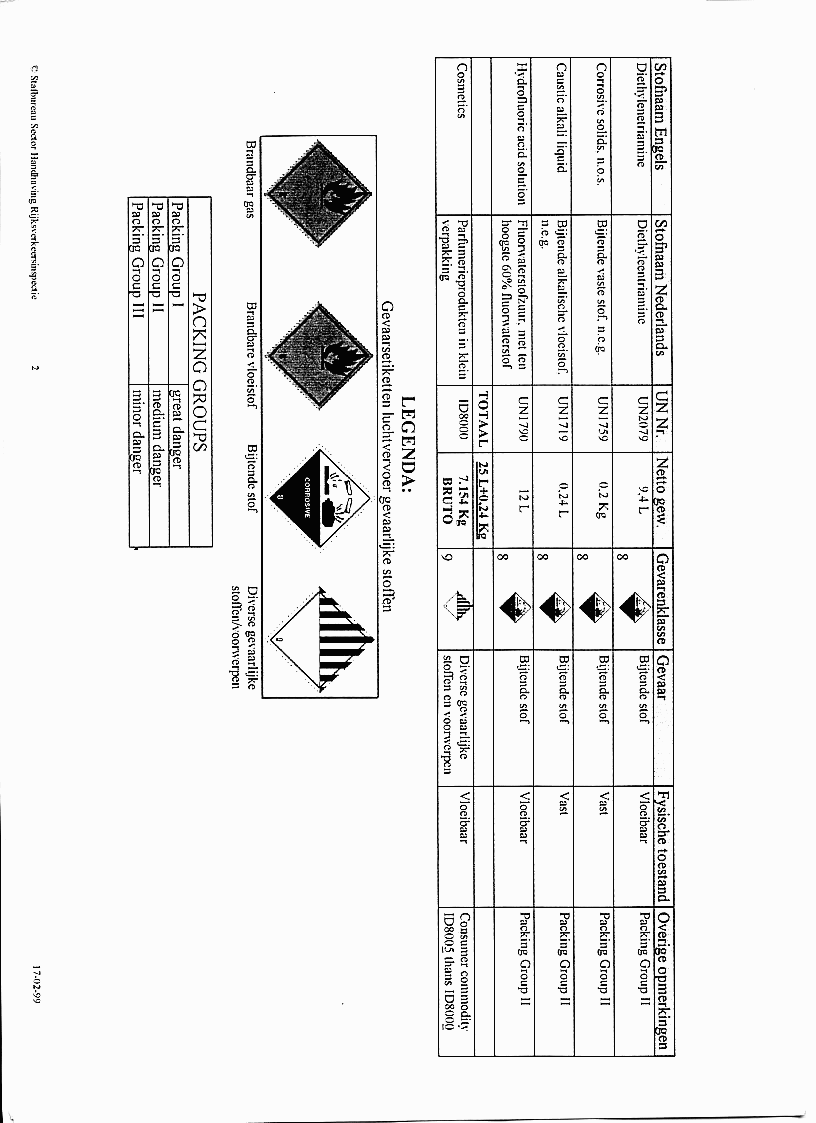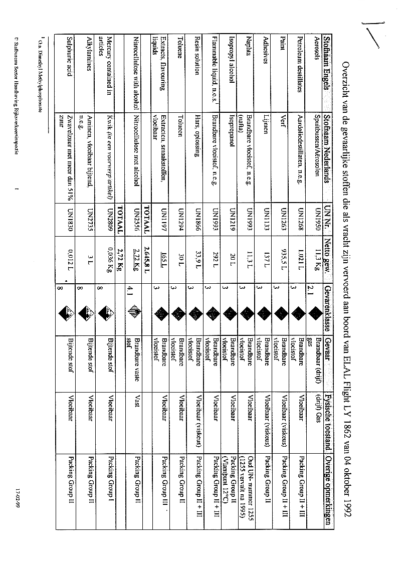 Deze lijst is niet compleet. Op de zogenaamde notoc die de gezagvoerder mee kreeg stonden in totaal 33 stoffen met de omschrijving 'Packing Group II', duidend op 'matig gevaarlijke stoffen'