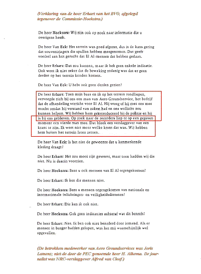 Ik zei zelf maar niets. Maar enkele van die mensen spraken Engels tegen elkaar. Ook tegen de Nederlanders die erbij waren spraken ze Engels. Ivriet heb ik niet gehoord - dat zou ik herkend hebben. Wel moet ik nu - achteraf - zeggen dat ze inderdaad een 'mediteraan uiterlijk' hadden. Ik denk, maar dat weet ik niet zeker, dat ik vanzelfsprekend heb aangenomen dat ze van El Al waren. Ik durfde geen aantekeningen te maken, bang om mezelf te verraden.'