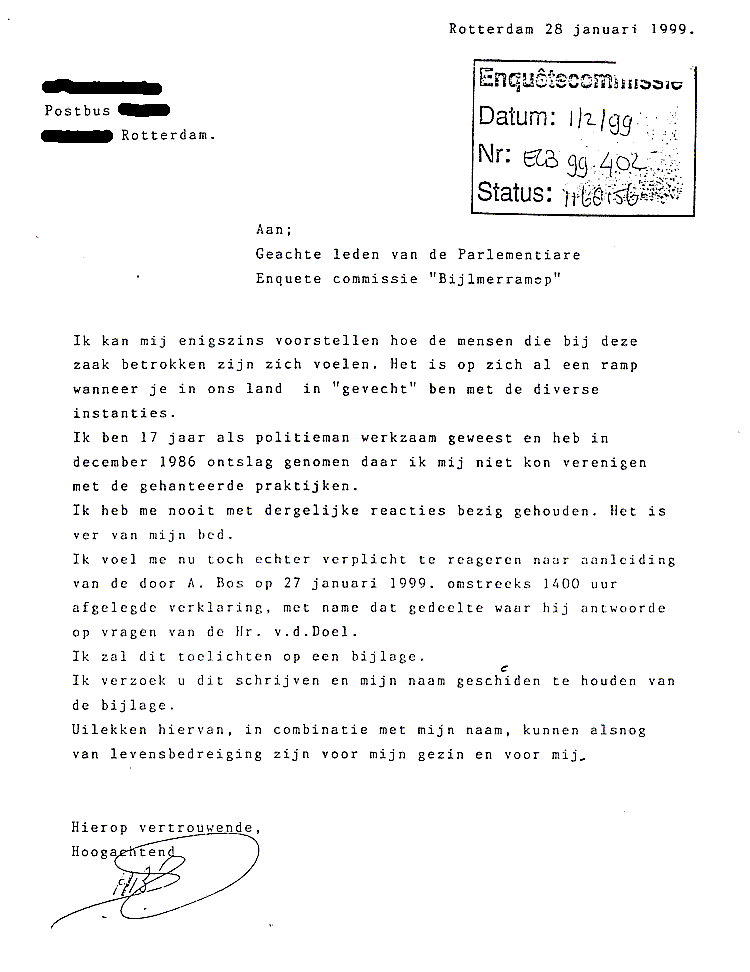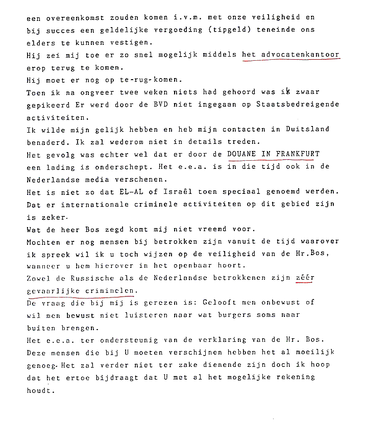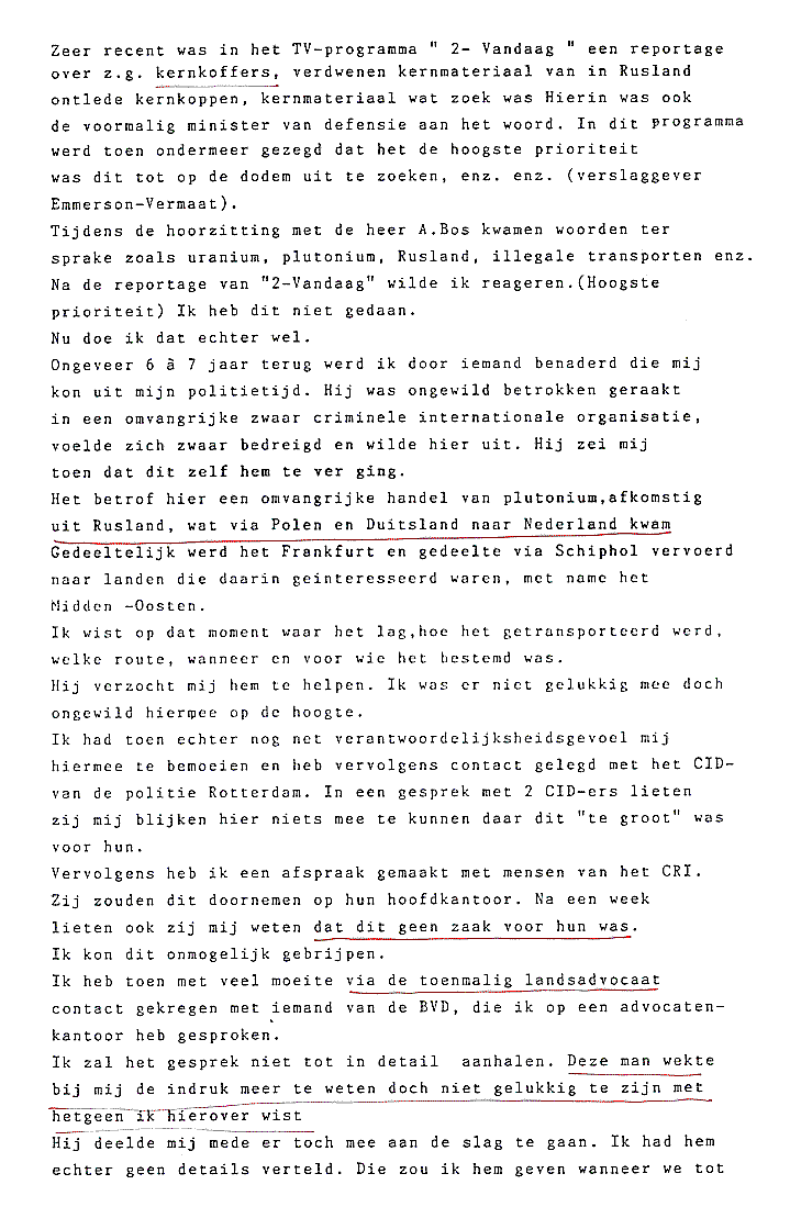 (20-01) Getuige André Bos had 'spookverhalen' verteld, suggereerde de PEC. Maar een paar dagen na zijn openbaar verhoor ontving de commissie een brief van een Rotterdamse politieman, die tegen dezelfde smokkellijn van radio-actief materiaal uit het Oostblok was aangelopen als Bos. En ook hij stootte 'hogerop' ten slotte zijn neus: er waren andere en hogere belangen dan die van een nieuwsgierige politieman. __________________________________________________________________________________