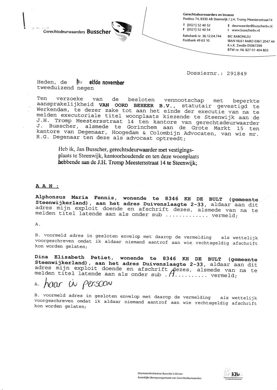Op 30 augustus 2010 was voor Fons Fennis de maat helemaal vol wat betreft de bestuurlijke, juridische en politieke nalatigheid van overheidinstellingen als de FIOD, het kadaster te Zwolle, de ministeries van Economische Zaken en van Financiën en de branche-organisaties als de Nederlandse Orde van Advocaten en de Broederschap van Notarissen.